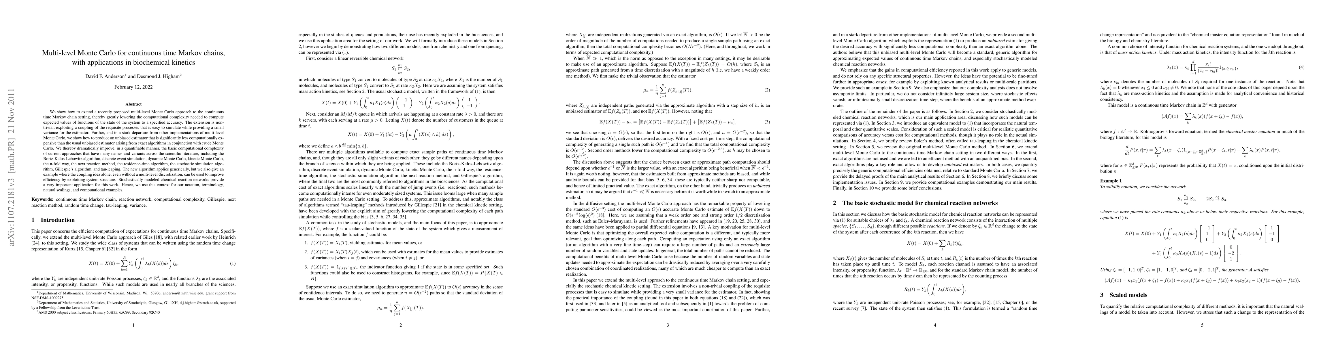 This paper extends a multi-level Monte Carlo approach to continuous time Markov chains, significantly reducing computational complexity for estimating system state functions. The method introduces an unbiased estimator that is less costly than traditional exact algorithms, improving upon various existing simulation techniques used in biochemical kinetics.