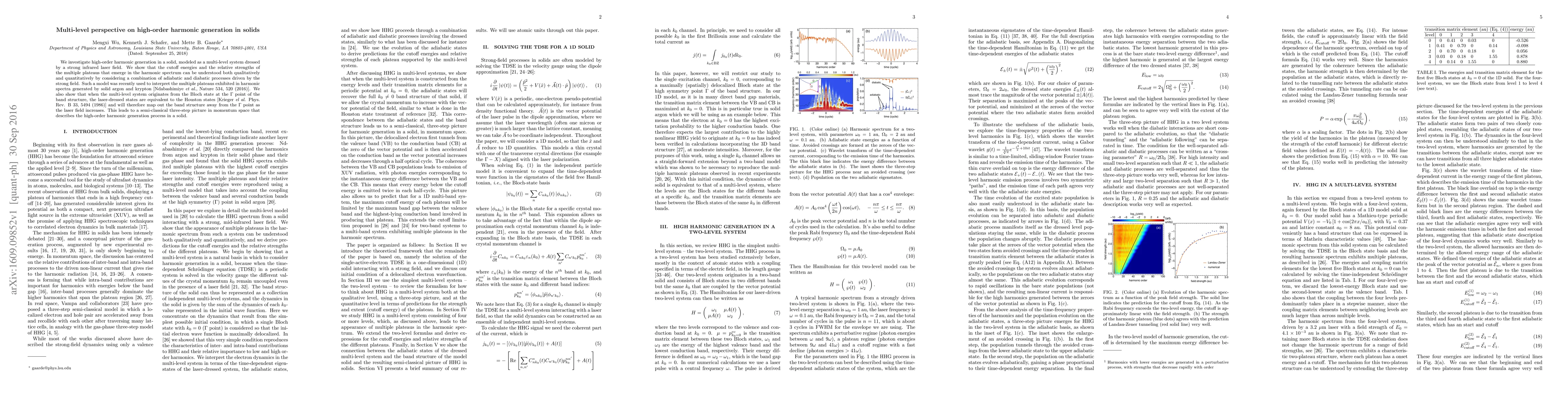 This paper explores high-order harmonic generation in solids using a multi-level system model influenced by a strong infrared laser field, revealing how adiabatic and diabatic processes determine harmonic spectrum cutoffs and plateaus. The study also connects laser-dressed Bloch states to Houston states, providing a semi-classical three-step momentum space model for the harmonic generation process.