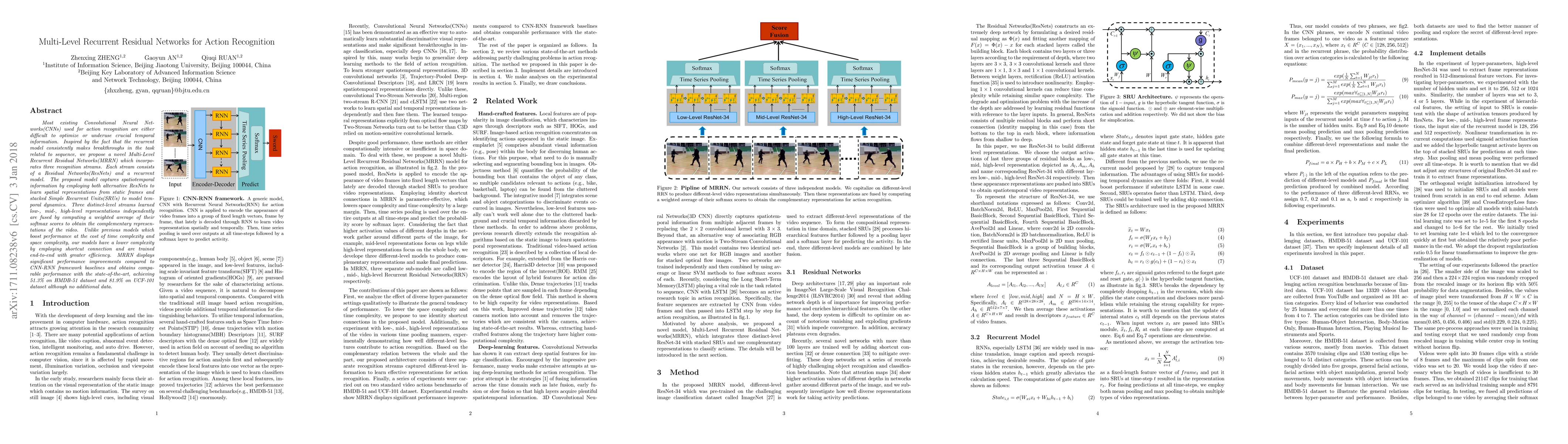 The paper proposes Multi-Level Recurrent Residual Networks (MRRN) to improve action recognition by combining Residual Networks with recurrent models to capture spatiotemporal information, achieving higher accuracy with lower complexity compared to baselines. The MRRN model demonstrates superior performance on HMDB-51 and UCF-101 datasets.