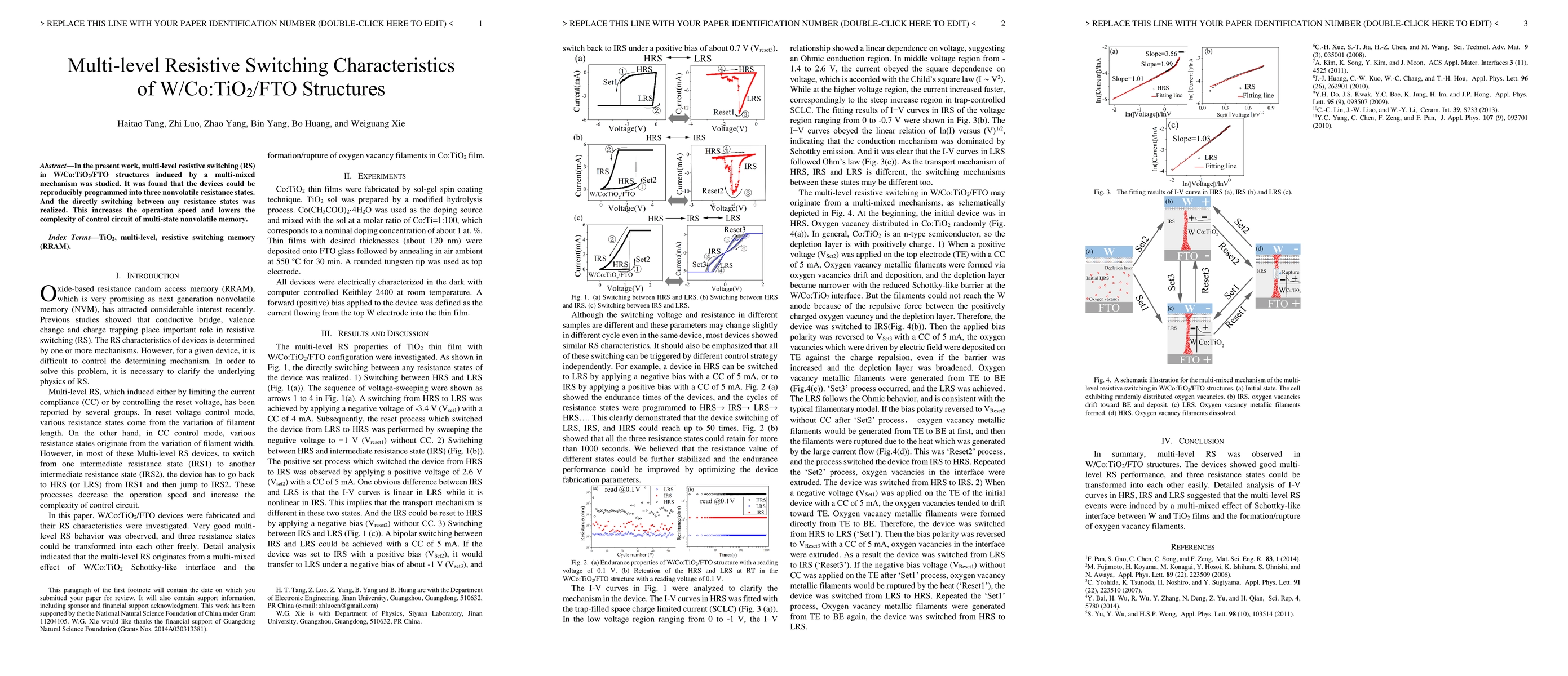 Researchers studied multi-level resistive switching in W/Co:TiO2/FTO structures, achieving three nonvolatile resistance states with improved operation speed and reduced control complexity for multi-state nonvolatile memory.