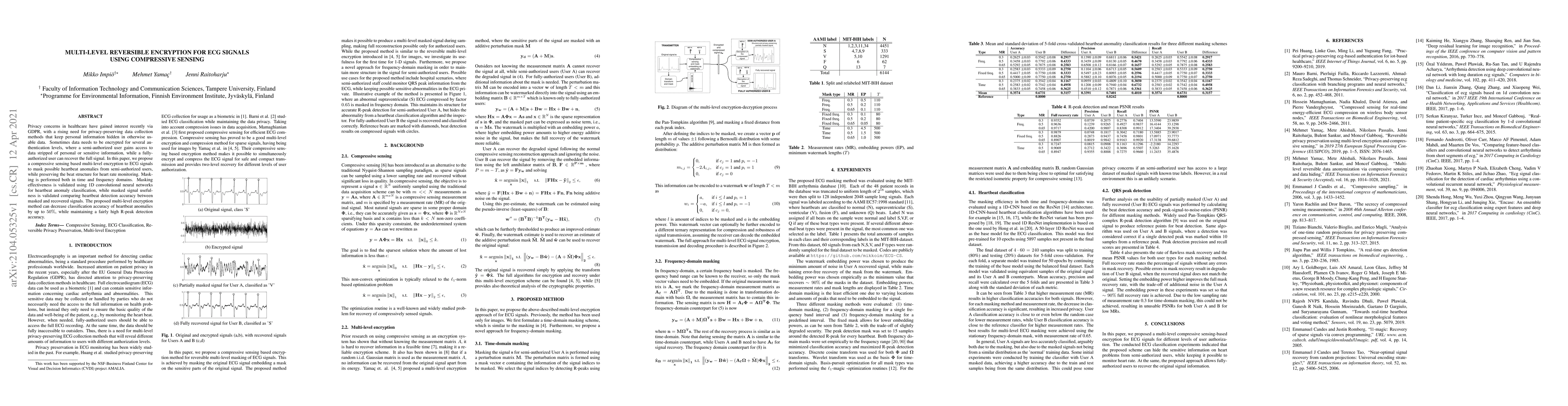 Privacy concerns in healthcare have gained interest recently via GDPR, with a rising need for privacy-preserving data collection methods that keep personal information hidden in otherwise usable data. Sometimes data needs to be encrypted for several authentication levels, where a semi-authorized user gains access to data stripped of personal or sensitive information, while a fully-authorized user can recover the full signal. In this paper, we propose a compressive sensing based multi-level encryption to ECG signals to mask possible heartbeat anomalies from semi-authorized users, while preserving the beat structure for heart rate monitoring. Masking is performed both in time and frequency domains. Masking effectiveness is validated using 1D convolutional neural networks for heartbeat anomaly classification, while masked signal usefulness is validated comparing heartbeat detection accuracy between masked and recovered signals. The proposed multi-level encryption method can decrease classification accuracy of heartbeat anomalies by up to 50%, while maintaining a fairly high R-peak detection accuracy.