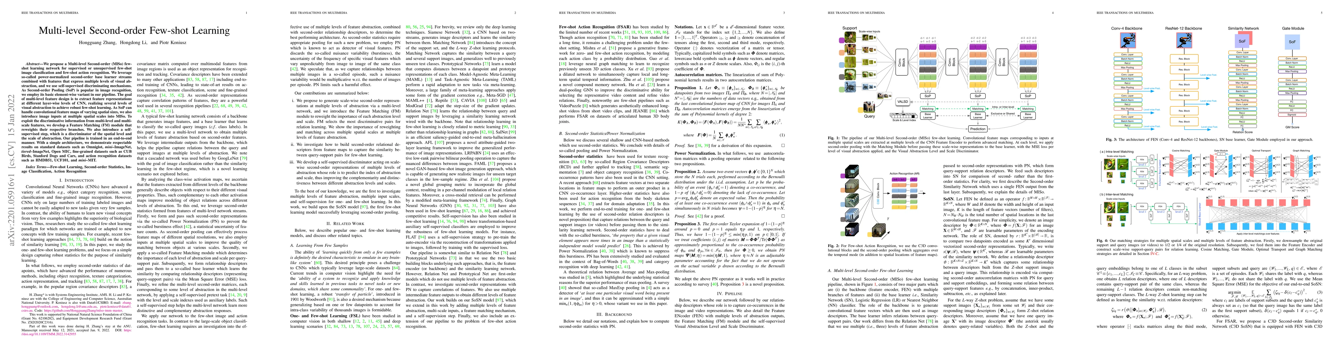 This paper proposes a Multi-level Second-order (MlSo) few-shot learning network that combines power-normalized second-order base learner streams with multi-level visual abstractions and self-supervised mechanisms for robust few-shot image classification and action recognition. The model achieves good results on various datasets by leveraging multi-scale inputs and a Feature Matching module.