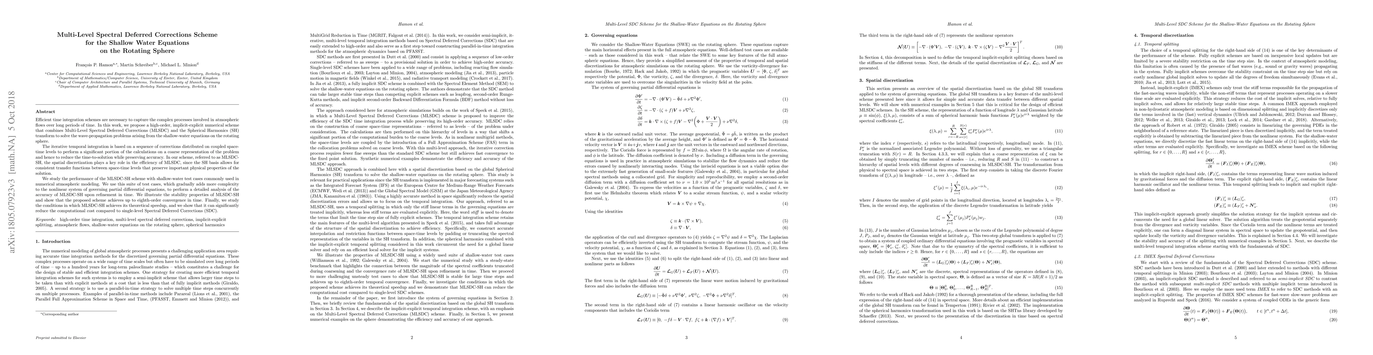 Efficient time integration schemes are necessary to capture the complex processes involved in atmospheric flows over long periods of time. In this work, we propose a high-order, implicit-explicit numerical scheme that combines Multi-Level Spectral Deferred Corrections (MLSDC) and the Spherical Harmonics (SH) transform to solve the wave-propagation problems arising from the shallow-water equations on the rotating sphere. The iterative temporal integration is based on a sequence of corrections distributed on coupled space-time levels to perform a significant portion of the calculations on a coarse representation of the problem and hence to reduce the time-to-solution while preserving accuracy. In our scheme, referred to as MLSDC-SH, the spatial discretization plays a key role in the efficiency of MLSDC, since the SH basis allows for consistent transfer functions between space-time levels that preserve important physical properties of the solution. We study the performance of the MLSDC-SH scheme with shallow-water test cases commonly used in numerical atmospheric modeling. We use this suite of test cases, which gradually adds more complexity to the nonlinear system of governing partial differential equations, to perform a detailed analysis of the convergence rate of MLSDC-SH upon refinement in time. We illustrate the good stability properties of MLSDC-SH and show that the proposed scheme achieves up to eighth-order accuracy in time. Finally, we study the conditions in which MLSDC-SH achieves its theoretical speedup, and we show that it can significantly reduce the computational cost compared to single-level Spectral Deferred Corrections (SDC).