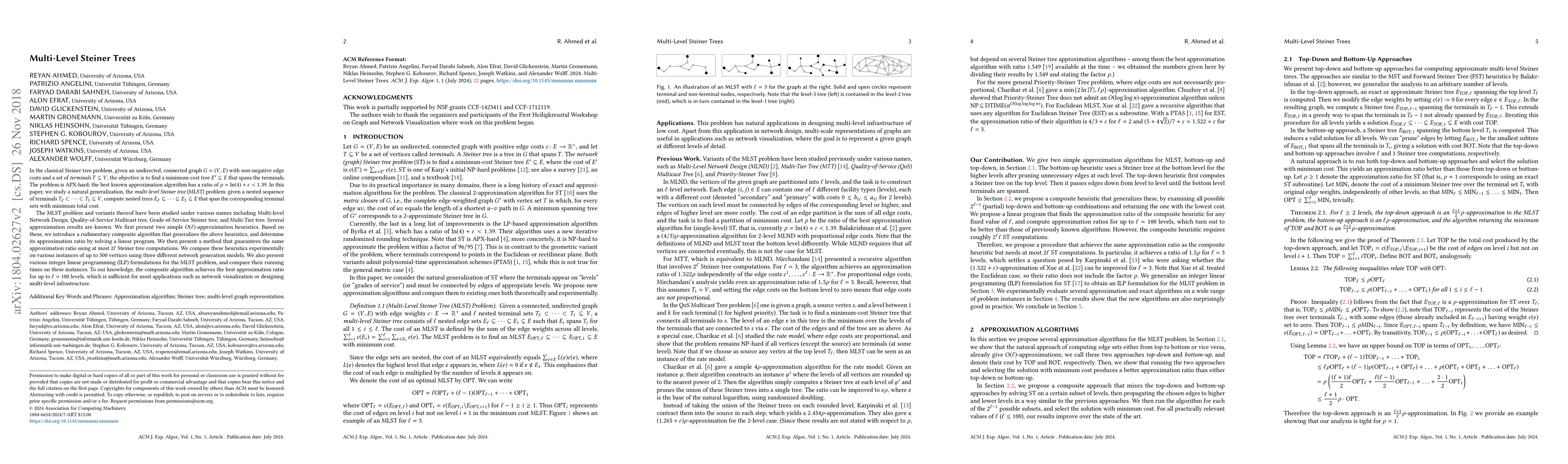 In the classical Steiner tree problem, given an undirected, connected graph $G=(V,E)$ with non-negative edge costs and a set of \emph{terminals} $T\subseteq V$, the objective is to find a minimum-cost tree $E' \subseteq E$ that spans the terminals. The problem is APX-hard; the best known approximation algorithm has a ratio of $\rho = \ln(4)+\varepsilon < 1.39$. In this paper, we study a natural generalization, the \emph{multi-level Steiner tree} (MLST) problem: given a nested sequence of terminals $T_{\ell} \subset \dots \subset T_1 \subseteq V$, compute nested trees $E_{\ell}\subseteq \dots \subseteq E_1\subseteq E$ that span the corresponding terminal sets with minimum total cost. The MLST problem and variants thereof have been studied under various names including Multi-level Network Design, Quality-of-Service Multicast tree, Grade-of-Service Steiner tree, and Multi-Tier tree. Several approximation results are known. We first present two simple $O(\ell)$-approximation heuristics. Based on these, we introduce a rudimentary composite algorithm that generalizes the above heuristics, and determine its approximation ratio by solving a linear program. We then present a method that guarantees the same approximation ratio using at most $2\ell$ Steiner tree computations. We compare these heuristics experimentally on various instances of up to 500 vertices using three different network generation models. We also present various integer linear programming (ILP) formulations for the MLST problem, and compare their running times on these instances. To our knowledge, the composite algorithm achieves the best approximation ratio for up to $\ell=100$ levels, which is sufficient for most applications such as network visualization or designing multi-level infrastructure.