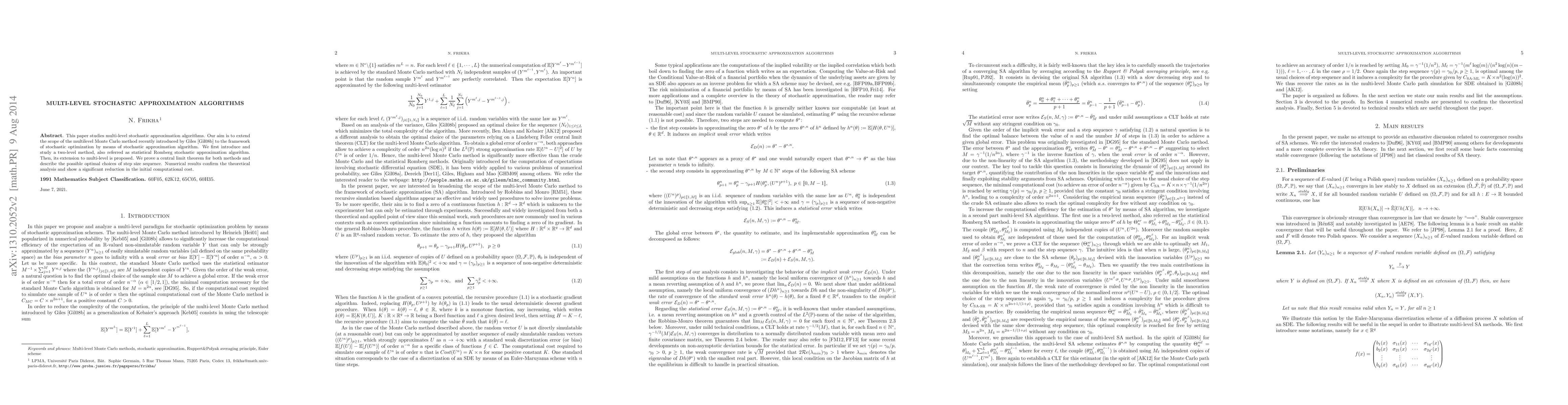 This paper studies multi-level stochastic approximation algorithms. Our aim is to extend the scope of the multilevel Monte Carlo method recently introduced by Giles (Giles 2008) to the framework of stochastic optimization by means of stochastic approximation algorithm. We first introduce and study a two-level method, also referred as statistical Romberg stochastic approximation algorithm. Then, its extension to multi-level is proposed. We prove a central limit theorem for both methods and describe the possible optimal choices of step size sequence. Numerical results confirm the theoretical analysis and show a significant reduction in the initial computational cost.