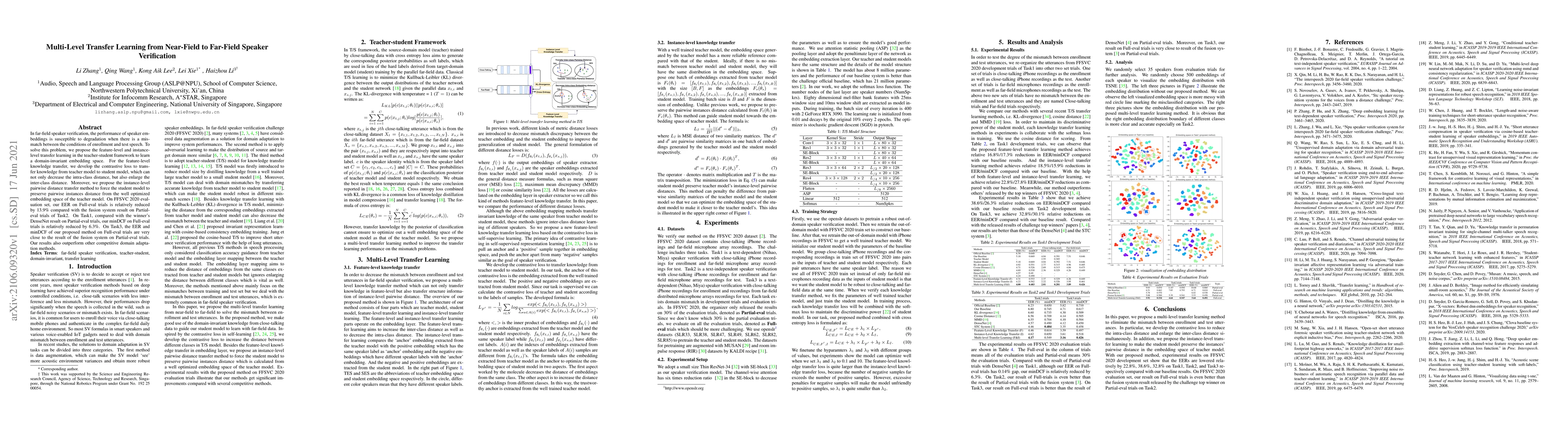 In far-field speaker verification, the performance of speaker embeddings is susceptible to degradation when there is a mismatch between the conditions of enrollment and test speech. To solve this problem, we propose the feature-level and instance-level transfer learning in the teacher-student framework to learn a domain-invariant embedding space. For the feature-level knowledge transfer, we develop the contrastive loss to transfer knowledge from teacher model to student model, which can not only decrease the intra-class distance, but also enlarge the inter-class distance. Moreover, we propose the instance-level pairwise distance transfer method to force the student model to preserve pairwise instances distance from the well optimized embedding space of the teacher model. On FFSVC 2020 evaluation set, our EER on Full-eval trials is relatively reduced by 13.9% compared with the fusion system result on Partial-eval trials of Task2. On Task1, compared with the winner's DenseNet result on Partial-eval trials, our minDCF on Full-eval trials is relatively reduced by 6.3%. On Task3, the EER and minDCF of our proposed method on Full-eval trials are very close to the result of the fusion system on Partial-eval trials. Our results also outperform other competitive domain adaptation methods.