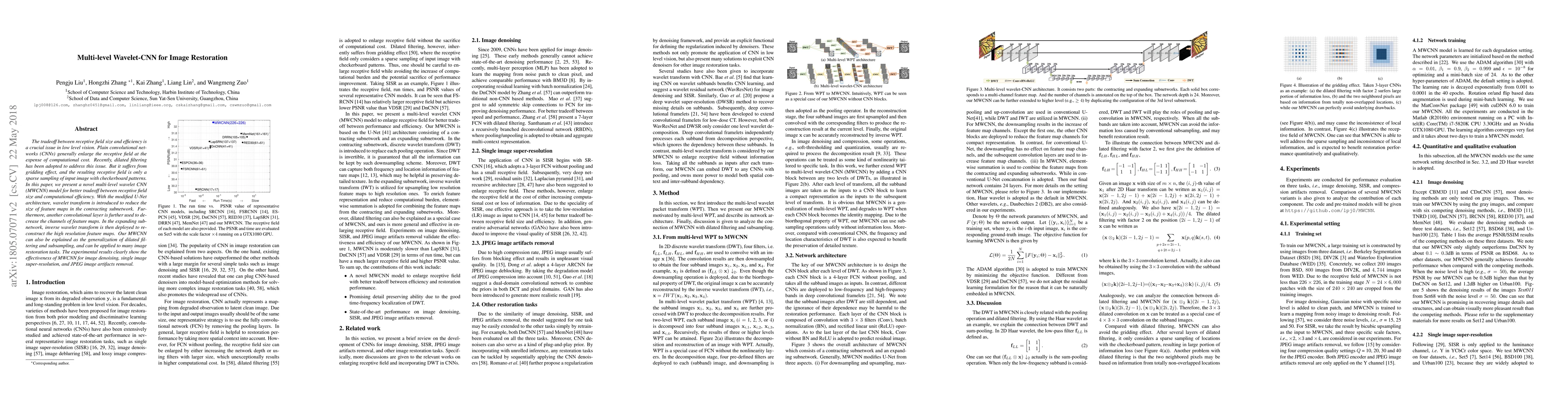 This paper introduces a multi-level wavelet CNN (MWCNN) model that balances receptive field size and computational efficiency, addressing the limitations of dilated filtering. The MWCNN uses wavelet transforms to reduce feature map sizes and channels, achieving high resolution reconstruction for various image restoration tasks.