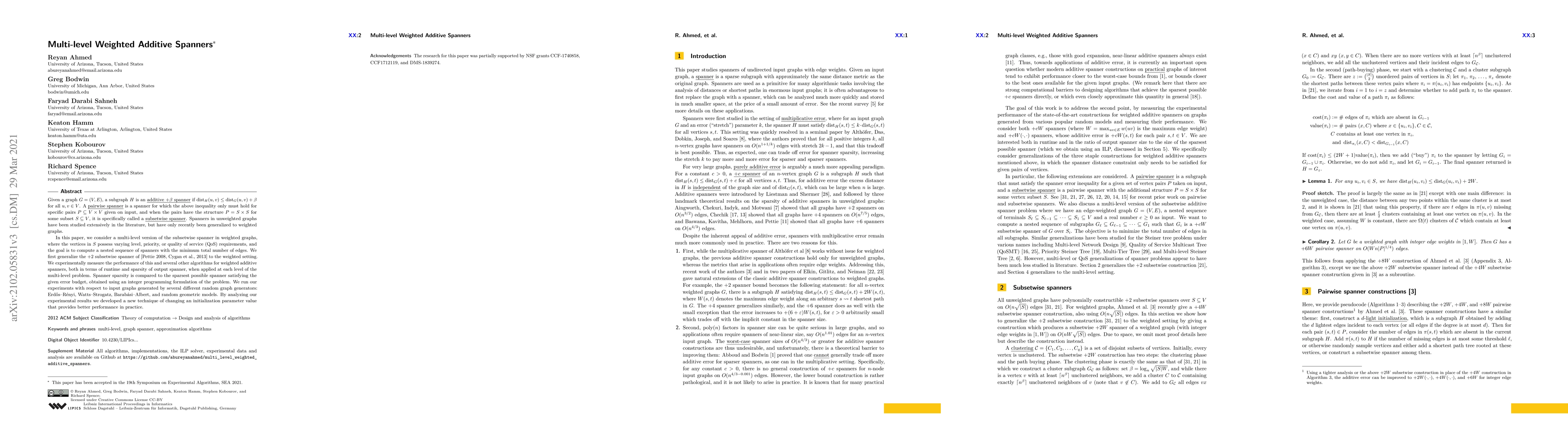 This paper explores multi-level weighted additive spanners in graphs where vertices have varying priority levels. The authors generalize subsetwise spanners to weighted graphs and experimentally evaluate various algorithms for their runtime and sparsity, comparing them against an integer programming formulation. They identify a technique that improves performance by adjusting an initialization parameter.