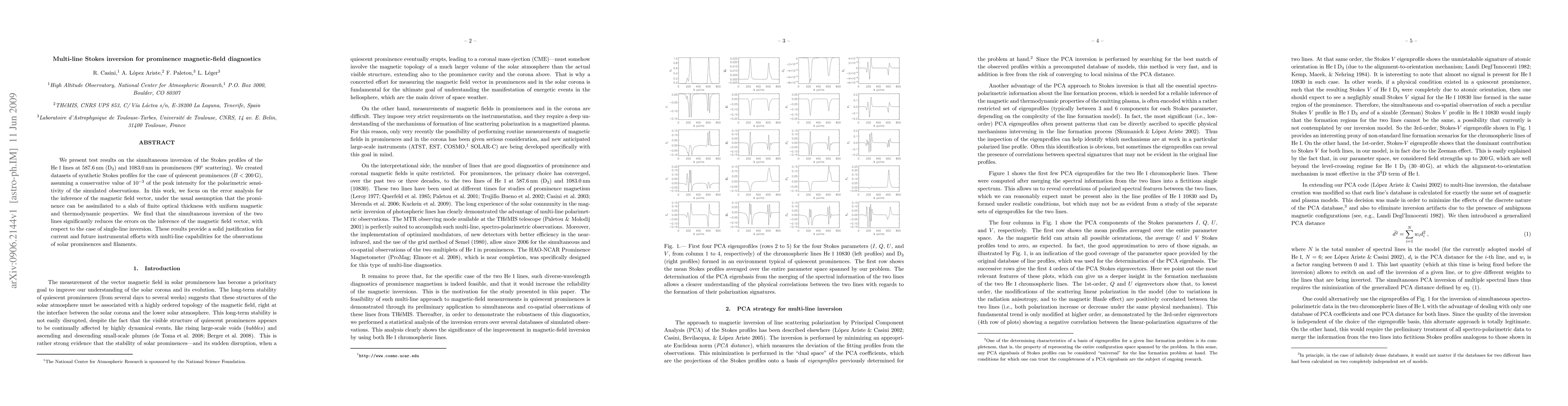 This paper presents a method for simultaneously inverting He I line Stokes profiles to diagnose magnetic fields in solar prominences, finding that multi-line inversions significantly reduce magnetic field vector error compared to single-line inversions. The study supports the use of multi-line instruments for future solar prominence observations.