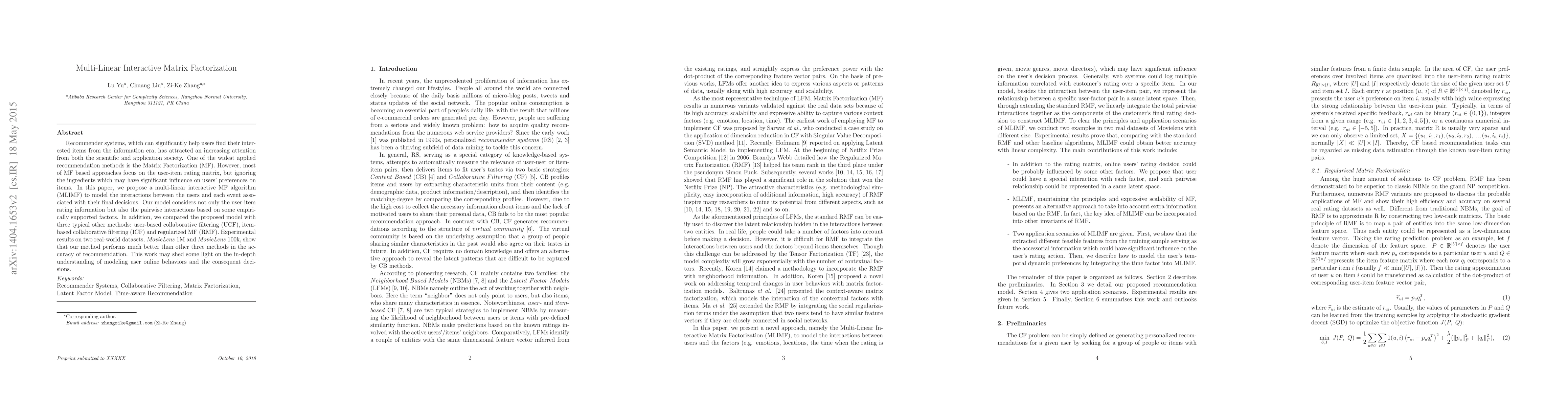 A new algorithm called Multi-Linear Interactive Matrix Factorization (MLIMF) is proposed to improve recommendation systems by considering user interactions and preferences. It outperforms traditional methods in accuracy on two real-world datasets.