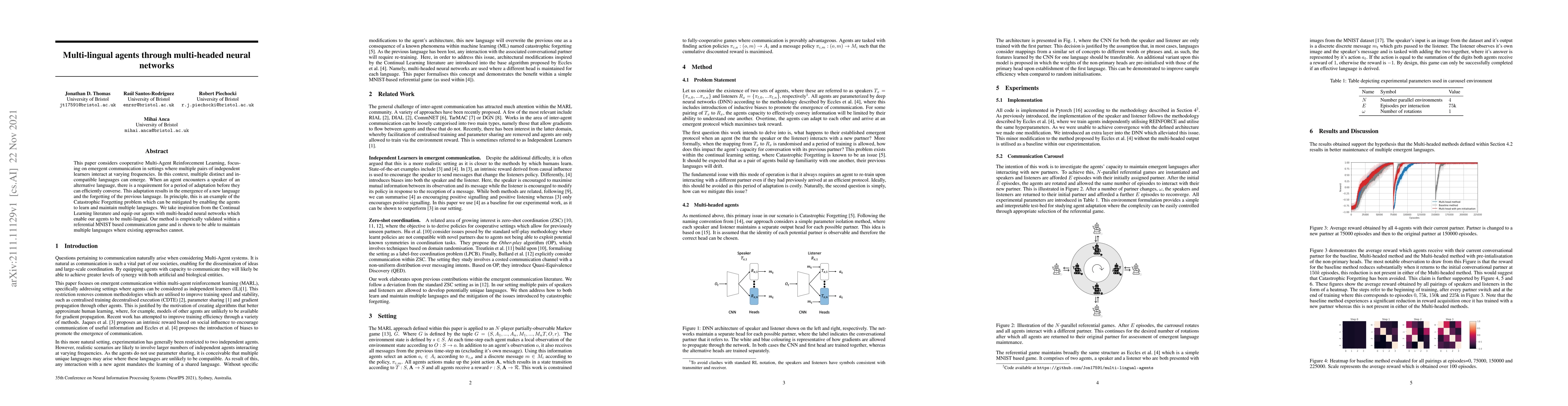 This paper explores multi-agent reinforcement learning with emergent communication, addressing the Catastrophic Forgetting problem by equipping agents with multi-headed neural networks to maintain multiple languages. The method is validated in a MNIST-based communication game, demonstrating superior multi-lingual capabilities.