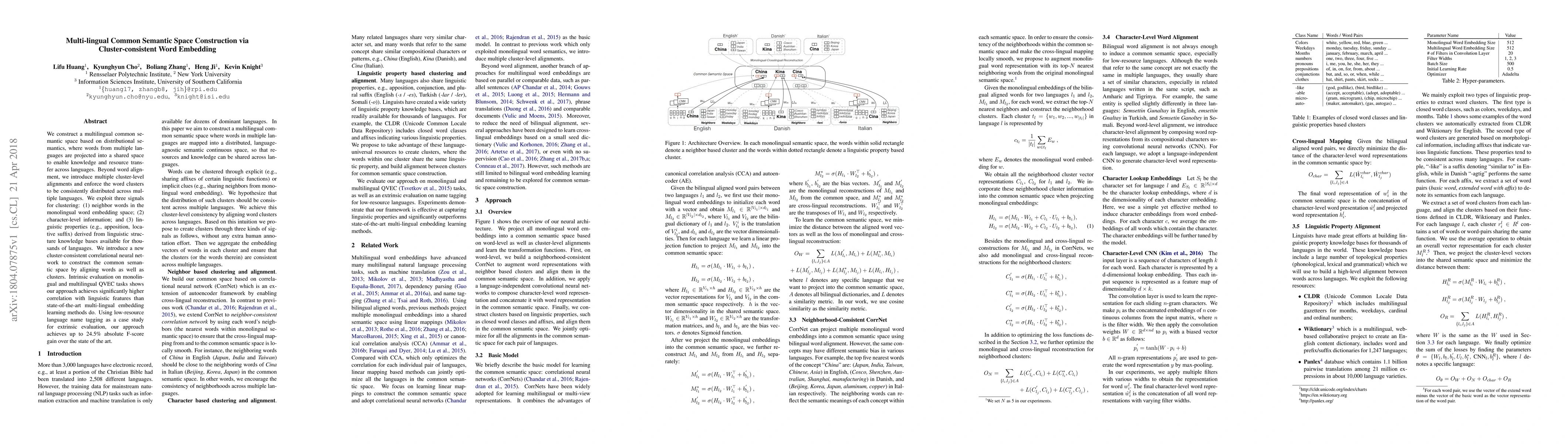 This paper constructs a multilingual common semantic space using cluster-consistent word embeddings, leveraging neighbor words, character-level information, and linguistic properties for alignment. The proposed method achieves superior performance in intrinsic and extrinsic evaluations, notably improving low-resource language name tagging.