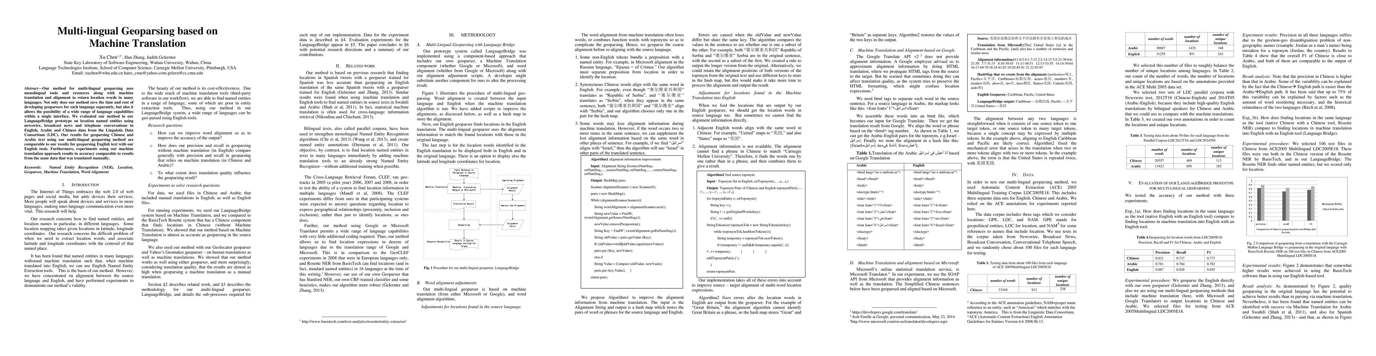 This paper proposes a method for multi-lingual geoparsing that leverages machine translation and alignment, eliminating the need for separate geoparsers for each language. The approach shows comparable results to manual translation and can handle multiple languages within a single interface.
