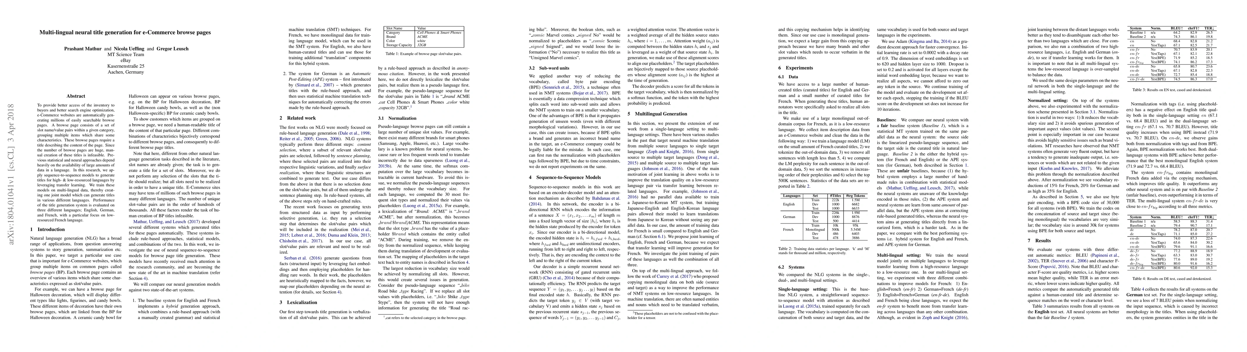 To provide better access of the inventory to buyers and better search engine optimization, e-Commerce websites are automatically generating millions of easily searchable browse pages. A browse page consists of a set of slot name/value pairs within a given category, grouping multiple items which share some characteristics. These browse pages require a title describing the content of the page. Since the number of browse pages are huge, manual creation of these titles is infeasible. Previous statistical and neural approaches depend heavily on the availability of large amounts of data in a language. In this research, we apply sequence-to-sequence models to generate titles for high- & low-resourced languages by leveraging transfer learning. We train these models on multi-lingual data, thereby creating one joint model which can generate titles in various different languages. Performance of the title generation system is evaluated on three different languages; English, German, and French, with a particular focus on low-resourced French language.