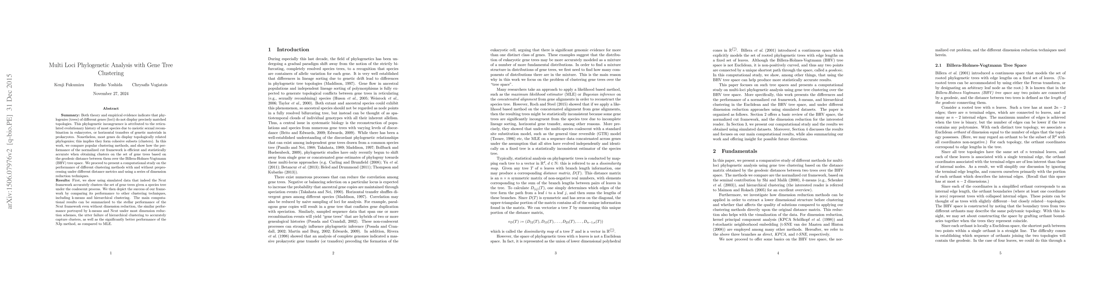 Summary: Both theory and empirical evidence indicate that phylogenies (trees) of different genes (loci) do not display precisely matched topologies. This phylogenetic incongruence is attributed to the reticulated evolutionary history of most species due to meiotic sexual recombination in eukaryotes, or horizontal transfers of genetic materials in prokaryotes. Nonetheless, most genes do display topologically related phylogenies; this implies they form cohesive subsets (clusters). In this work, we compare popular clustering methods, and show how the performance of the normalized cut framework is efficient and statistically accurate when obtaining clusters on the set of gene trees based on the geodesic distance between them over the Billera-Holmes-Vogtmann (BHV) tree space. We proceed to present a computational study on the performance of different clustering methods with and without preprocessing under different distance metrics and using a series of dimension reduction techniques. Results: First, we show using simulated data that indeed the Ncut framework accurately clusters the set of gene trees given a species tree under the coalescent process. We then depict the success of our framework by comparing its performance to other clustering techniques, including k-means and hierarchical clustering. The main computational results can be summarized to the stellar performance of the Ncut framework even without dimension reduction, the similar performance portrayed by k-means and Ncut under most dimension reduction schemes, the utter failure of hierarchical clustering to accurately capture clusters, as well as the significantly better performance of the NJp method, as compared to MLE.
