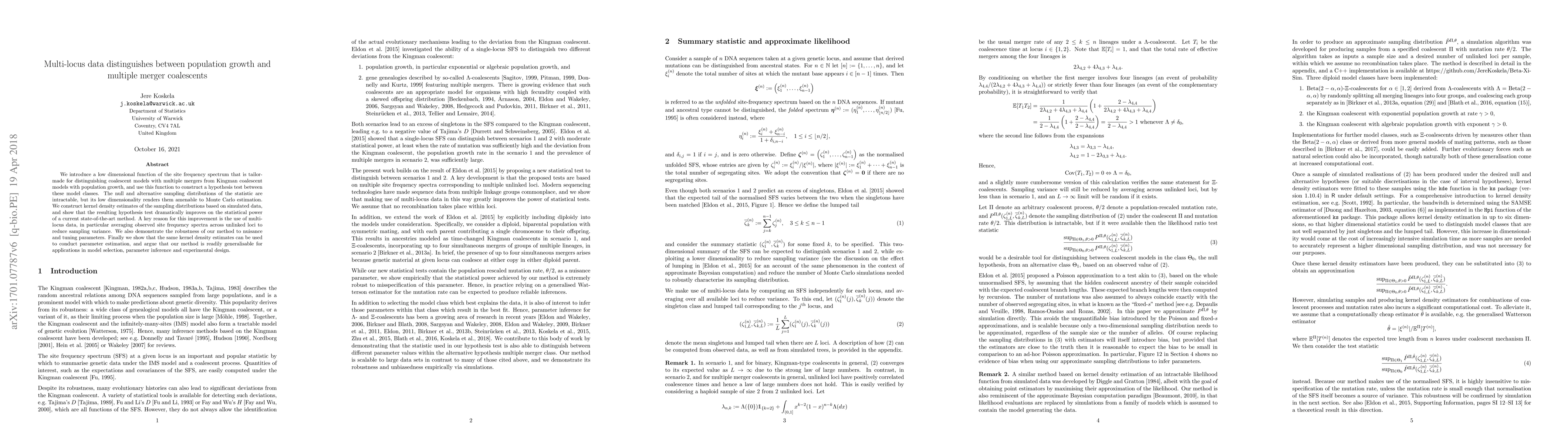 We introduce a low dimensional function of the site frequency spectrum that is tailor-made for distinguishing coalescent models with multiple mergers from Kingman coalescent models with population growth, and use this function to construct a hypothesis test between these model classes. The null and alternative sampling distributions of the statistic are intractable, but its low dimensionality renders them amenable to Monte Carlo estimation. We construct kernel density estimates of the sampling distributions based on simulated data, and show that the resulting hypothesis test dramatically improves on the statistical power of a current state-of-the-art method. A key reason for this improvement is the use of multi-locus data, in particular averaging observed site frequency spectra across unlinked loci to reduce sampling variance. We also demonstrate the robustness of our method to nuisance and tuning parameters. Finally we show that the same kernel density estimates can be used to conduct parameter estimation, and argue that our method is readily generalisable for applications in model selection, parameter inference and experimental design.