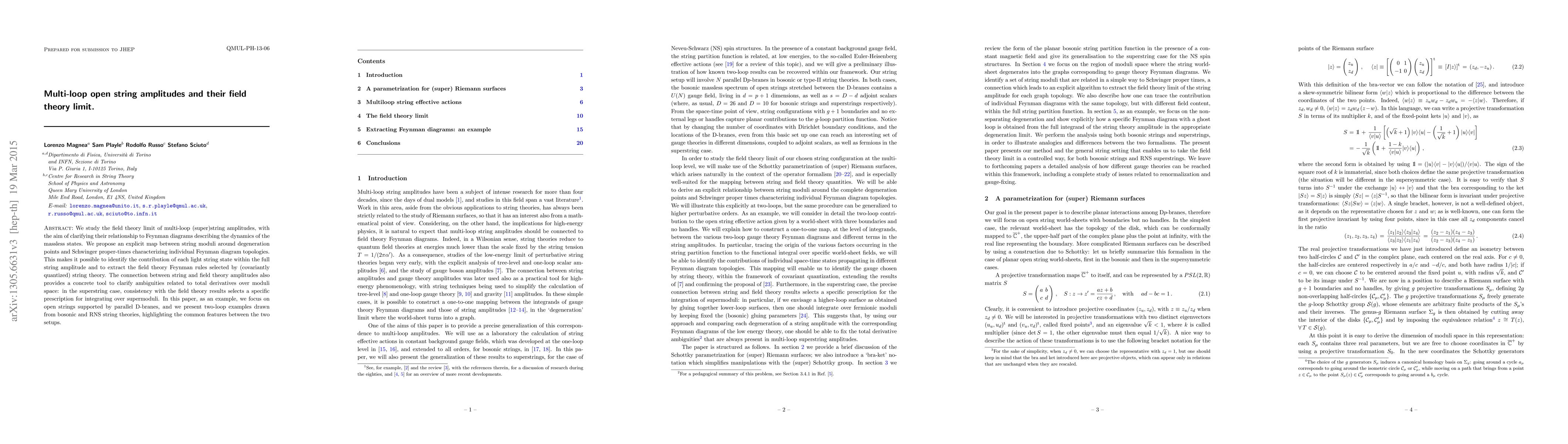 We study the field theory limit of multi-loop (super)string amplitudes, with the aim of clarifying their relationship to Feynman diagrams describing the dynamics of the massless states. We propose an explicit map between string moduli around degeneration points and Schwinger proper-times characterizing individual Feynman diagram topologies. This makes it possible to identify the contribution of each light string state within the full string amplitude and to extract the field theory Feynman rules selected by (covariantly quantized) string theory. The connection between string and field theory amplitudes also provides a concrete tool to clarify ambiguities related to total derivatives over moduli space: in the superstring case, consistency with the field theory results selects a specific prescription for integrating over supermoduli. In this paper, as an example, we focus on open strings supported by parallel D-branes, and we present two-loop examples drawn from bosonic and RNS string theories, highlighting the common features between the two setups.