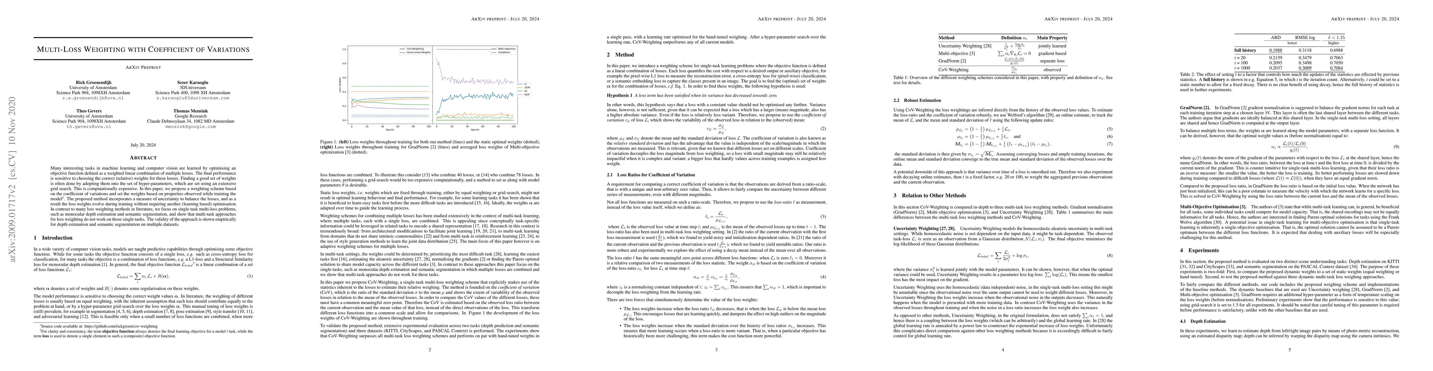 This paper proposes a method for dynamically adjusting loss weights during training using the coefficient of variations, which balances losses based on observed training properties without requiring additional optimization. Empirical results demonstrate its effectiveness for single-task multi-loss problems like monocular depth estimation and semantic segmentation.