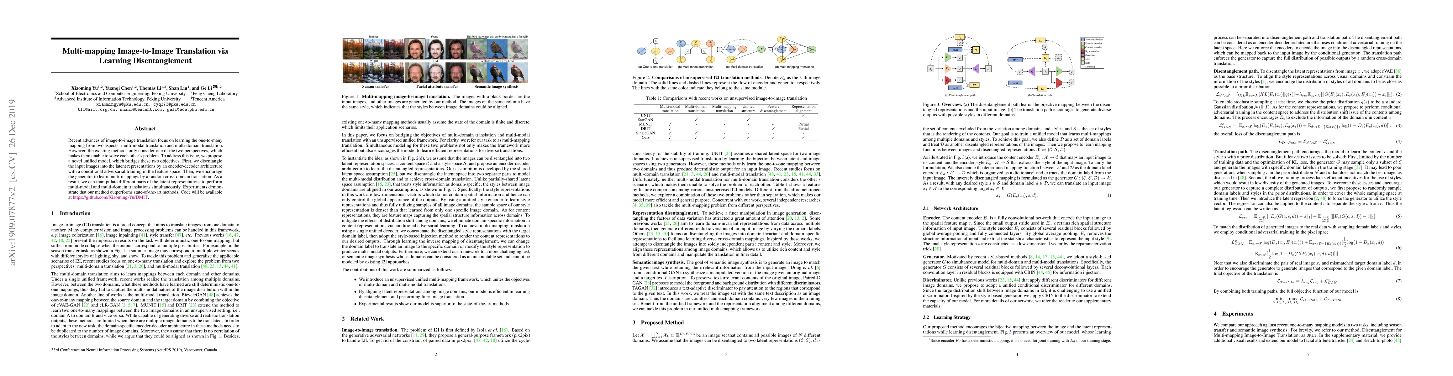 This paper proposes a unified model for multi-mapping image-to-image translation by learning disentanglement, addressing both multi-modal and multi-domain translation challenges. The model disentangles input images into latent representations and encourages multi-mapping through random cross-domain translation, outperforming existing methods.