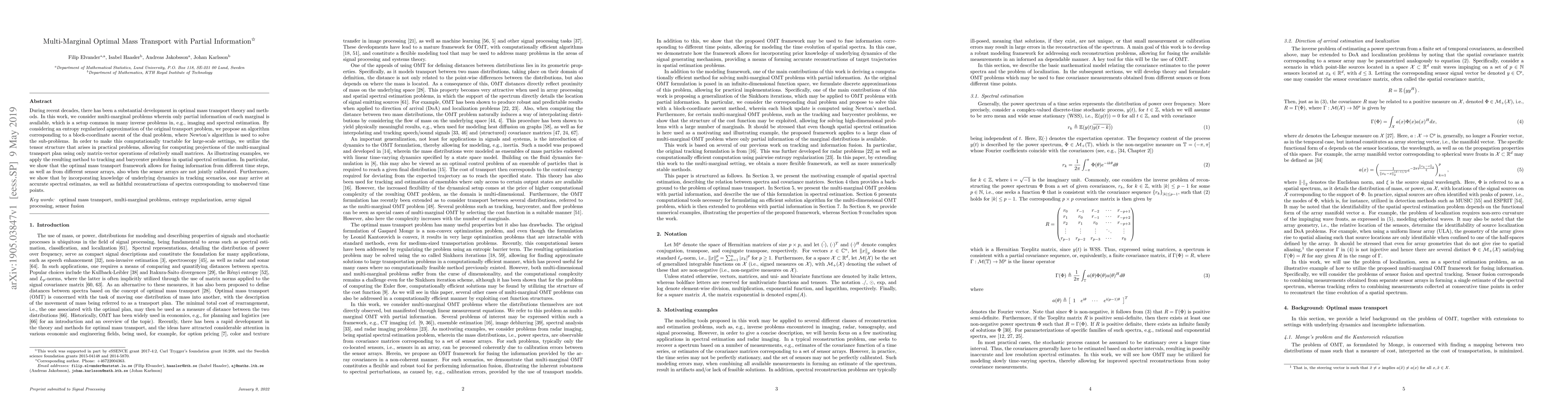 During recent decades, there has been a substantial development in optimal mass transport theory and methods. In this work, we consider multi-marginal problems wherein only partial information of each marginal is available, which is a setup common in many inverse problems in, e.g., imaging and spectral estimation. By considering an entropy regularized approximation of the original transport problem, we propose an algorithm corresponding to a block-coordinate ascent of the dual problem, where Newton's algorithm is used to solve the sub-problems. In order to make this computationally tractable for large-scale settings, we utilize the tensor structure that arises in practical problems, allowing for computing projections of the multi-marginal transport plan using only matrix-vector operations of relatively small matrices. As illustrating examples, we apply the resulting method to tracking and barycenter problems in spatial spectral estimation. In particular, we show that the optimal mass transport framework allows for fusing information from different time steps, as well as from different sensor arrays, also when the sensor arrays are not jointly calibrated. Furthermore, we show that by incorporating knowledge of underlying dynamics in tracking scenarios, one may arrive at accurate spectral estimates, as well as faithful reconstructions of spectra corresponding to unobserved time points.