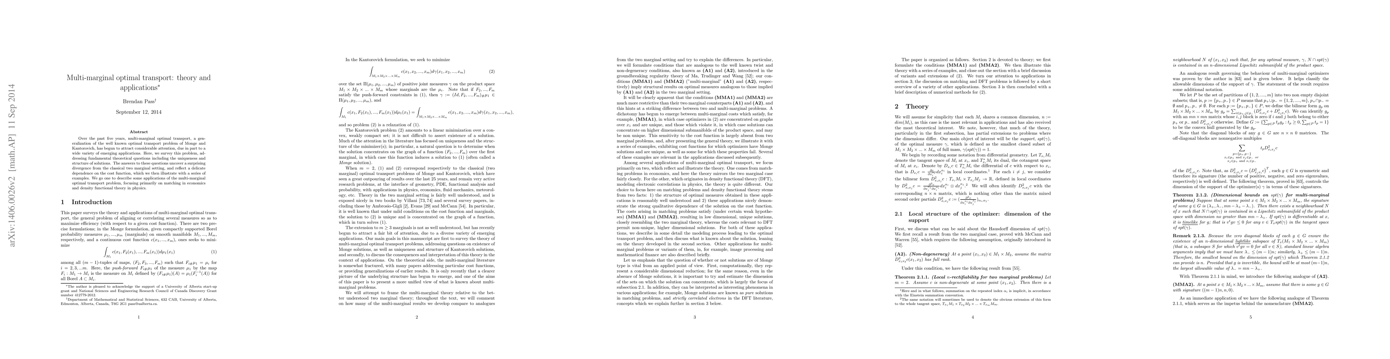 Over the past five years, multi-marginal optimal transport, a generalization of the well known optimal transport problem of Monge and Kantorovich, has begun to attract considerable attention, due in part to a wide variety of emerging applications. Here, we survey this problem, addressing fundamental theoretical questions including the uniqueness and structure of solutions. The (partial) answers to these questions uncover a surprising divergence from the classical two marginal setting, and reflect a delicate dependence on the cost function. We go one to describe two applications of the multi-marginal problem.