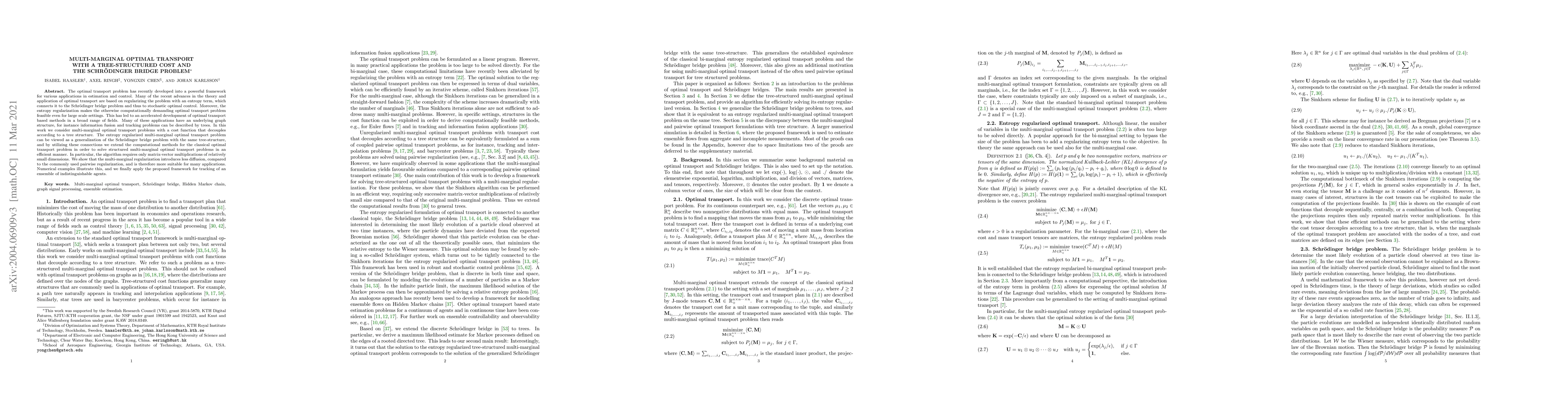 The optimal transport problem has recently developed into a powerful framework for various applications in estimation and control. Many of the recent advances in the theory and application of optimal transport are based on regularizing the problem with an entropy term, which connects it to the Schr\"odinger bridge problem and thus to stochastic optimal control. Moreover, the entropy regularization makes the otherwise computationally demanding optimal transport problem feasible even for large scale settings. This has lead to an accelerated development of optimal transport based methods in a broad range of fields. Many of these applications have a underlying graph structure, for instance information fusion and tracking problems can be described by trees. In this work we consider multi-marginal optimal transport problems with a cost function that decouples according to a tree structure. The entropy regularized multi-marginal optimal transport problem can be viewed as a generalization of the Schr\"odinger bridge problem with the same tree-structure, and by utilizing these connections we extend the computational methods for the classical optimal transport problem in order to solve structured multi-marginal optimal transport problems in an efficient manner. In particular, the algorithm requires only matrix-vector multiplications of relatively small dimensions. We show that the multi-marginal regularization introduces less diffusion, compared to the commonly used pairwise regularization, and is therefore more suitable for many applications. Numerical examples illustrate this, and we finally apply the proposed framework for tracking of an ensemble of indistinguishable agents.