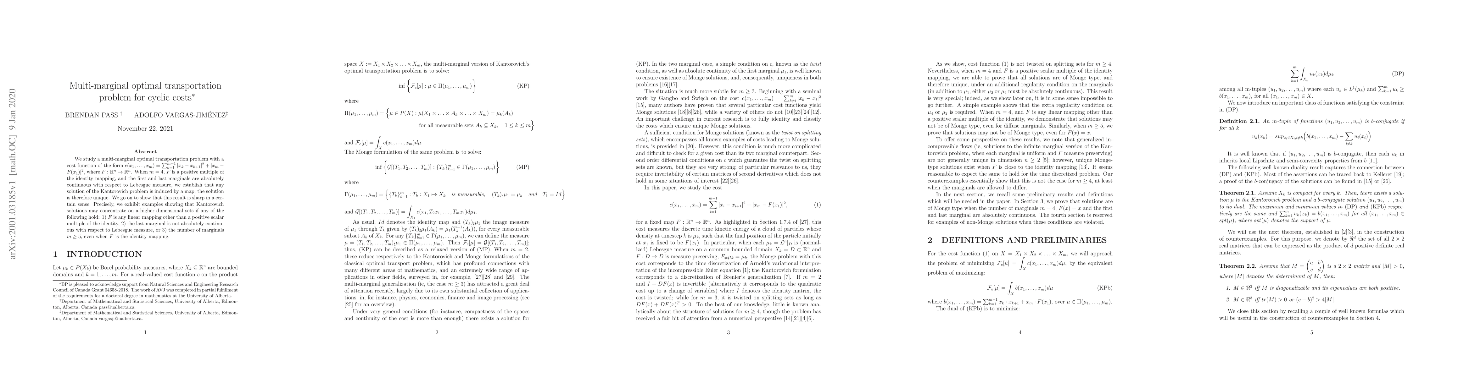 We study a multi-marginal optimal transportation problem with a cost function of the form $c(x_{1}, \ldots,x_{m})=\sum_{k=1}^{m-1}|x_{k}-x_{k+1}|^{2} + |x_{m}- F(x_{1})|^{2}$, where $F: \mathbb{R}^n \rightarrow \mathbb{R}^n$. When $m=4$, $F$ is a positive multiple of the identity mapping, and the first and last marginals are absolutely continuous with respect to Lebesgue measure, we establish that any solution of the Kantorovich problem is induced by a map; the solution is therefore unique. We go on to show that this result is sharp in a certain sense. Precisely, we exhibit examples showing that Kantorovich solutions may concentrate on a higher dimensional sets if any of the following hold: 1) $F$ is any linear mapping other than a positive scalar multiple of the identity, 2) the last marginal is not absolutely continuous with respect to Lebesgue measure, or 3) the number of marginals $m \geq 5$, even when $F$ is the identity mapping.