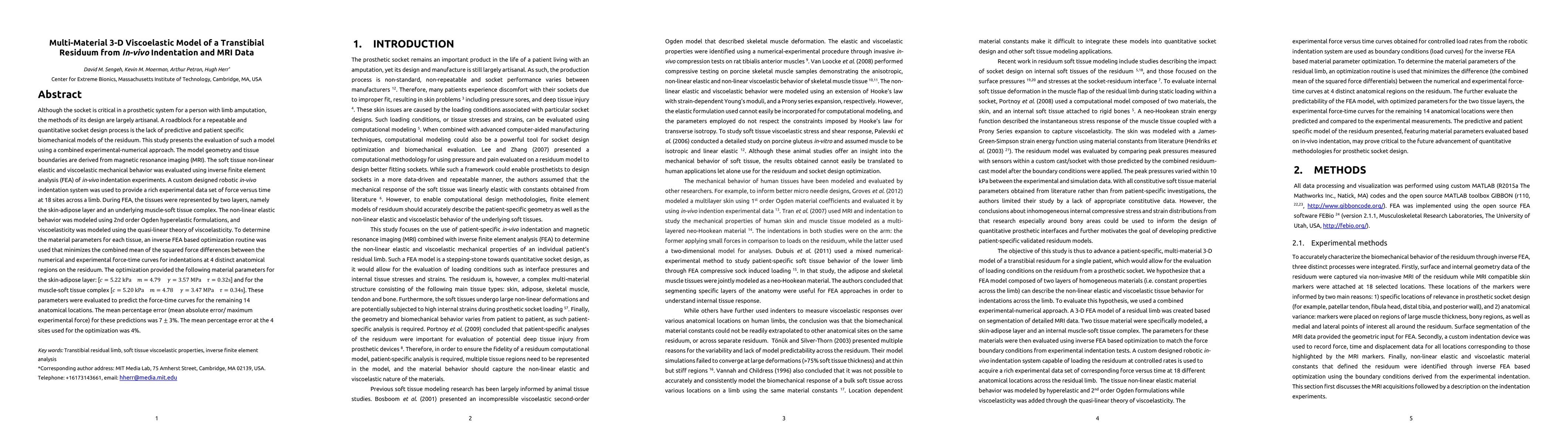 This study develops a multi-material 3-D viscoelastic model of a transtibial residuum using MRI data and in-vivo indentation experiments, achieving a mean percentage error of 7% in force-time curve predictions across 14 anatomical locations. The model employs inverse finite element analysis to determine tissue-specific material parameters.