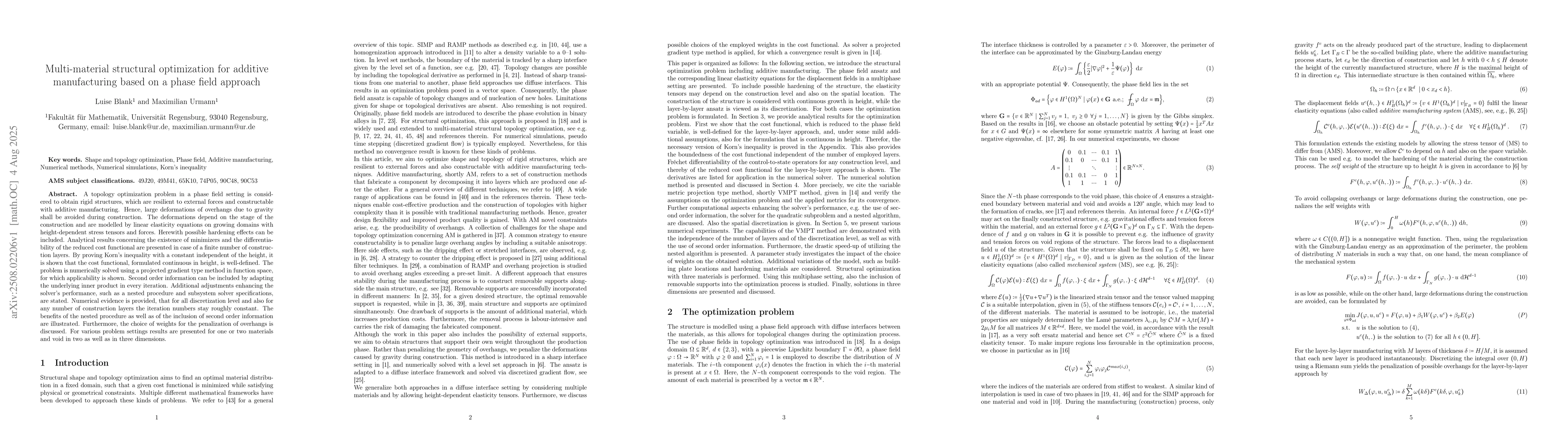 A topology optimization problem in a phase field setting is considered to obtain rigid structures, which are resilient to external forces and constructable with additive manufacturing. Hence, large deformations of overhangs due to gravity shall be avoided during construction. The deformations depend on the stage of the construction and are modelled by linear elasticity equations on growing domains with height-dependent stress tensors and forces. Herewith, possible hardening effects can be included. Analytical results concerning the existence of minimizers and the differentiability of the reduced cost functional are presented in case of a finite number of construction layers. By proving Korn's inequality with a constant independent of the height, it is shown that the cost functional, formulated continuously in height, is well-defined. The problem is numerically solved using a projected gradient type method in function space, for which applicability is shown. Second-order information can be included by adapting the underlying inner product in every iteration. Additional adjustments enhancing the solver's performance, such as a nested procedure and subsystem solver specifcations, are stated. Numerical evidence is provided that for all discretization level and also for any number of construction layers, the iteration numbers stay roughly constant. The benefits of the nested procedure as well as of the inclusion of second order information are illustrated. Furthermore, the choice of weights for the penalization of overhangs is discussed. For various problem settings, results are presented for one or two materials and void in two as well as in three dimensions.