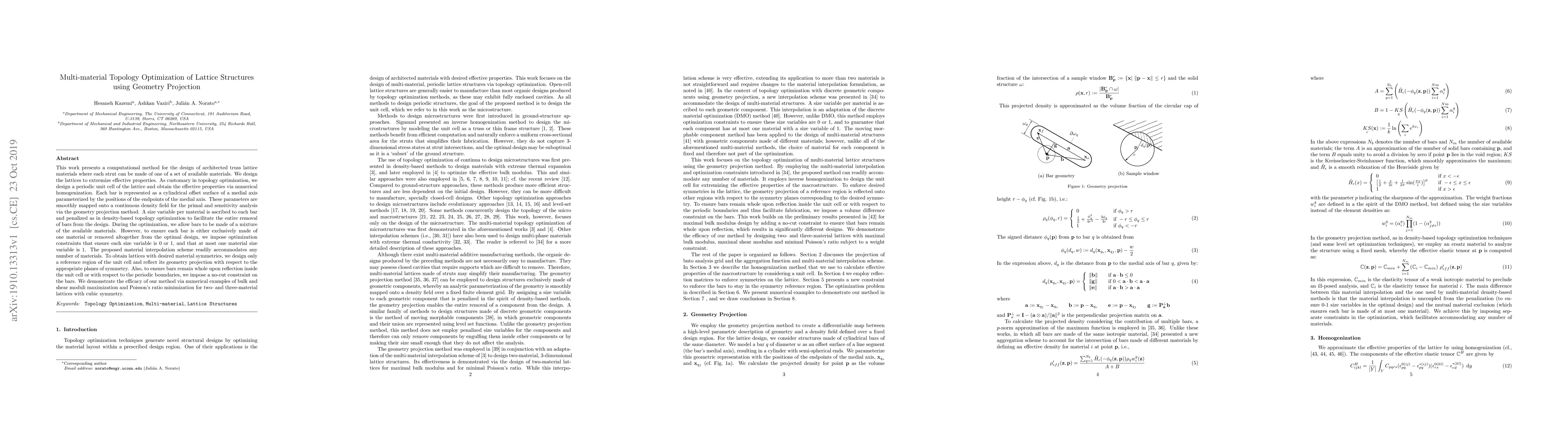 This paper introduces a computational method for optimizing multi-material lattice structures using geometry projection, allowing each strut to be composed of different materials. The method enforces constraints to ensure material exclusivity or removal, and demonstrates its effectiveness through examples maximizing bulk and shear moduli and minimizing Poisson's ratio.