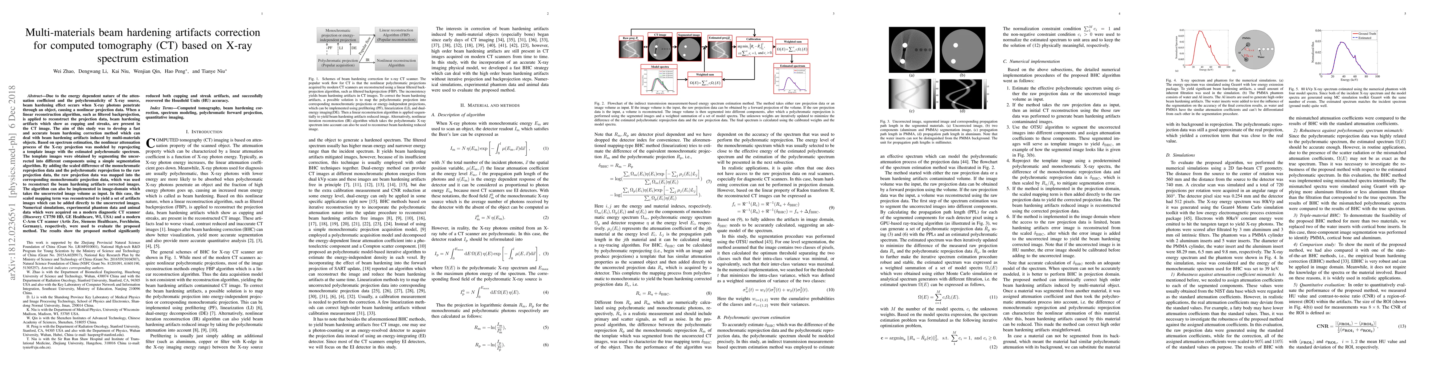 This study proposes a fast and accurate beam hardening correction method for CT imaging based on X-ray spectrum estimation to address artifacts caused by multi-material objects. The method models the nonlinear attenuation process using reprojected template images and significantly reduces cupping and streak artifacts while improving Hounsfield Units accuracy, as demonstrated through simulations and real-world CT scans.