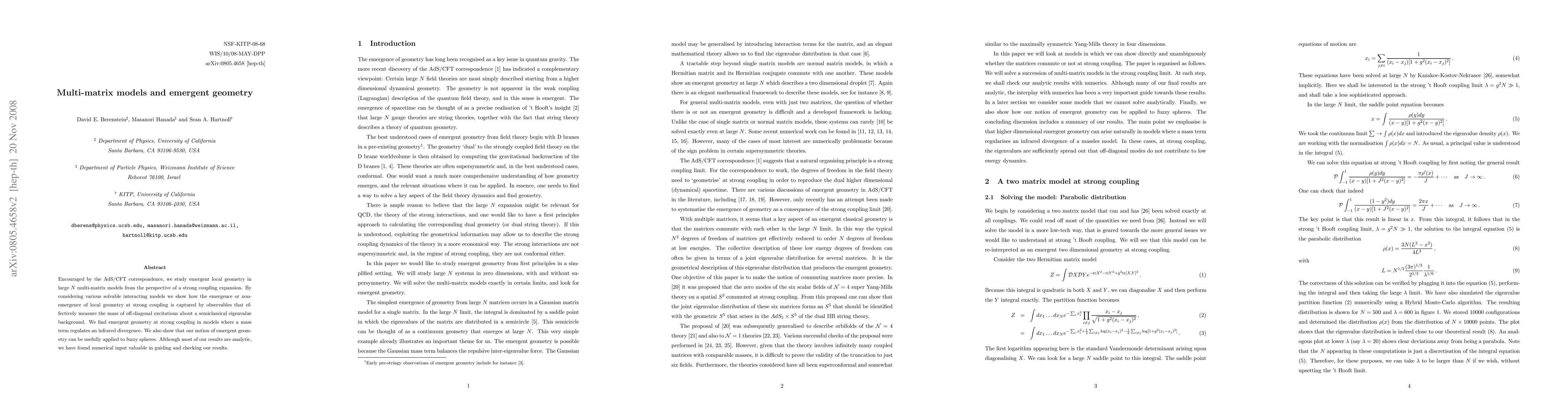 This paper explores emergent local geometry in large N multi-matrix models via strong coupling expansions, revealing that geometry emerges where a mass term regulates infrared divergences. Numerical results complement the analytic findings, and the concept is applied to fuzzy spheres.