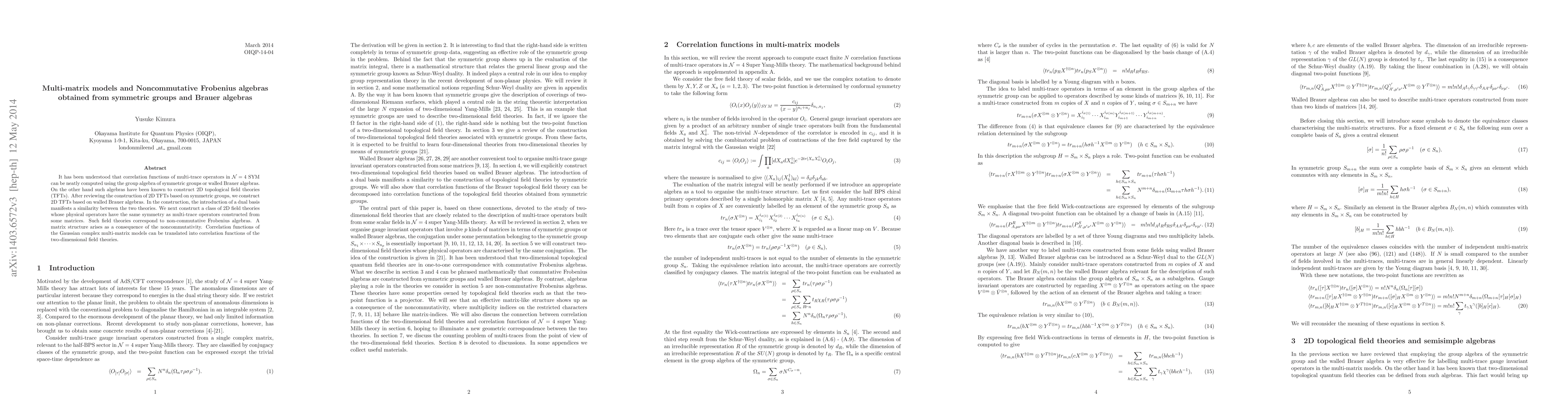 It has been understood that correlation functions of multi-trace operators in ${\cal N}=4$ SYM can be neatly computed using the group algebra of symmetric groups or walled Brauer algebras. On the other hand such algebras have been known to construct 2D topological field theories (TFTs). After reviewing the construction of 2D TFTs based on symmetric groups, we construct 2D TFTs based on walled Brauer algebras. In the construction, the introduction of a dual basis manifests a similarity between the two theories. We next construct a class of 2D field theories whose physical operators have the same symmetry as multi-trace operators constructed from some matrices. Such field theories correspond to non-commutative Frobenius algebras. A matrix structure arises as a consequence of the noncommutativity. Correlation functions of the Gaussian complex multi-matrix models can be translated into correlation functions of the two-dimensional field theories.