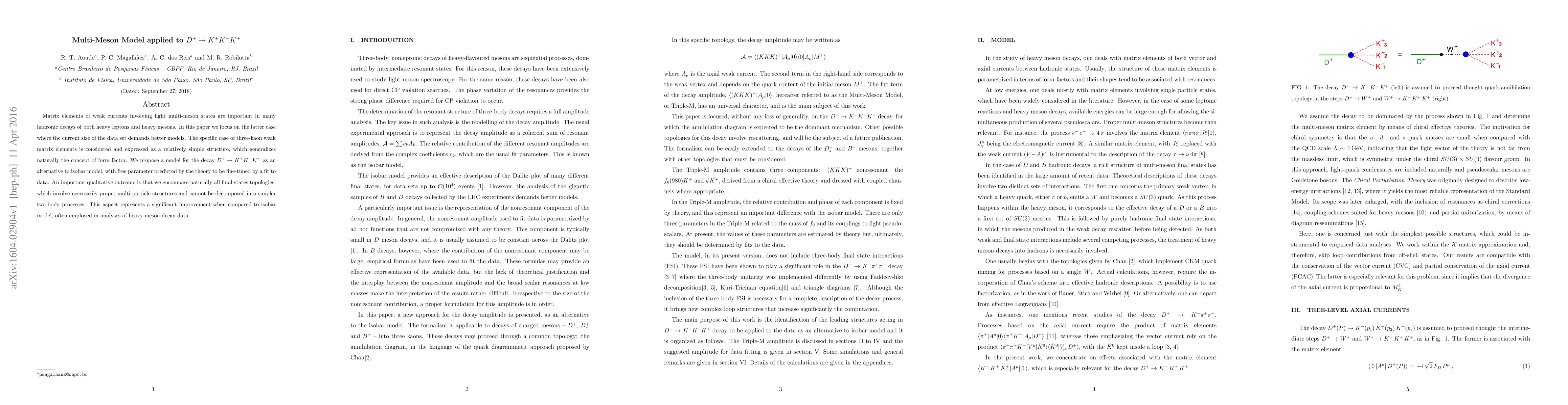 Matrix elements of weak currents involving light multi-meson states are important in many hadronic decays of both heavy leptons and heavy mesons. In this paper we focus on the latter case where the current size of the data set demands better models. The specific case of three-kaon weak matrix elements is considered and expressed as a relatively simple structure, which generalizes naturally the concept of form factor. We propose a model for the decay $D^+ \to K^+ K^- K^+$ as an alternative to isobar model, with free parameter predicted by the theory to be fine-tuned by a fit to data. An important qualitative outcome is that we encompass naturally all final states topologies, which involve necessarily proper multi-particle structures and cannot be decomposed into simpler two-body processes. This aspect represents a significant improvement when compared to isobar model, often employed in analyses of heavy-meson decay data.