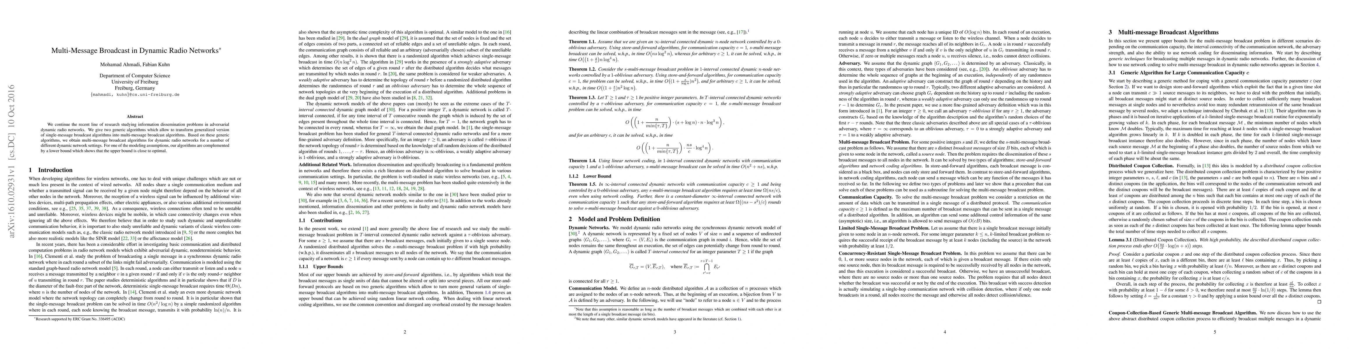 This paper presents two generic algorithms to transform single-message broadcast algorithms into multi-message versions for dynamic radio networks. The algorithms are shown to be effective across various dynamic network settings, with one assumption supported by a lower bound demonstrating near-optimality.