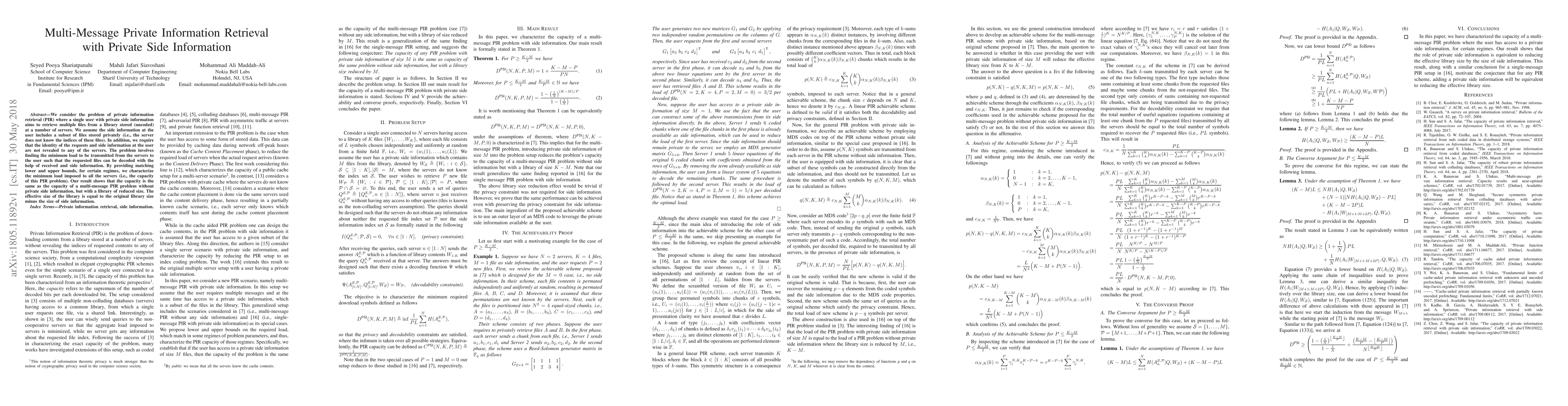 This paper addresses the challenge of private information retrieval (PIR) for a user with private side information, aiming to retrieve multiple files from a library without revealing request details. It finds the minimum load for servers to transmit data, showing that the capacity is equivalent to a multi-message PIR problem without private side information, but with a reduced library size.