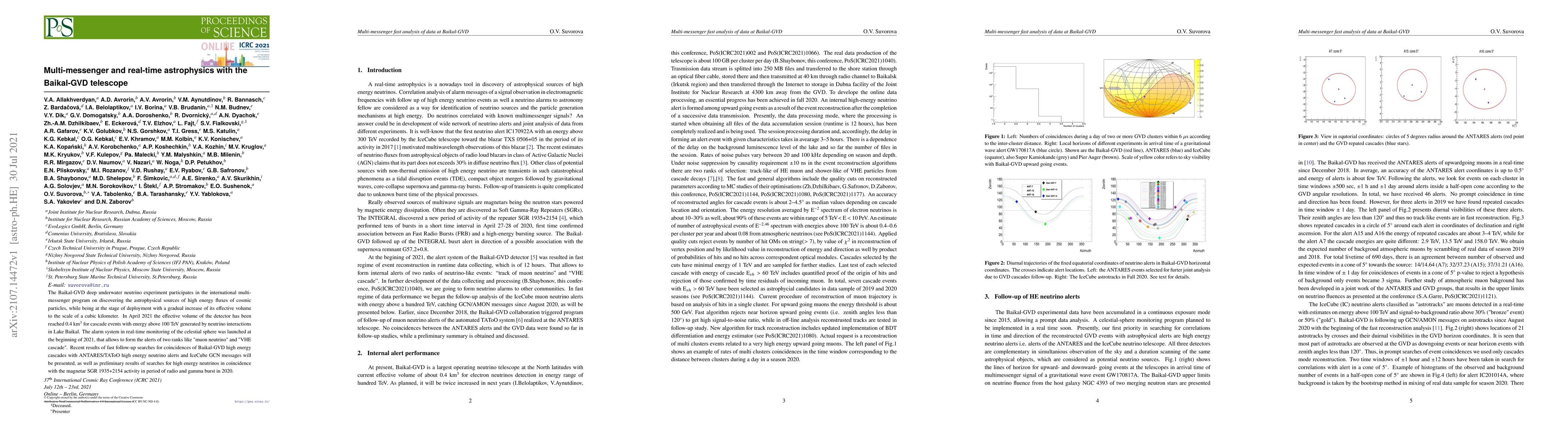 The Baikal-GVD deep underwater neutrino experiment participates in the international multi-messenger program on discovering the astrophysical sources of high energy fluxes of cosmic particles, while being at the stage of deployment with a gradual increase of its effective volume to the scale of a cubic kilometer. In April 2021 the effective volume of the detector has been reached 0.4 km3 for cascade events with energy above 100 TeV generated by neutrino interactions in Lake Baikal. The alarm system in real-time monitoring of the celestial sphere was launched at the beginning of 2021, that allows to form the alerts of two ranks like "muon neutrino" and "VHE cascade". Recent results of fast follow-up searches for coincidences of Baikal-GVD high energy cascades with ANTARES/TAToO high energy neutrino alerts and IceCube GCN messages will be presented, as well as preliminary results of searches for high energy neutrinos in coincidence with the magnetar SGR 1935+2154 activity in period of radio and gamma burst in 2020.