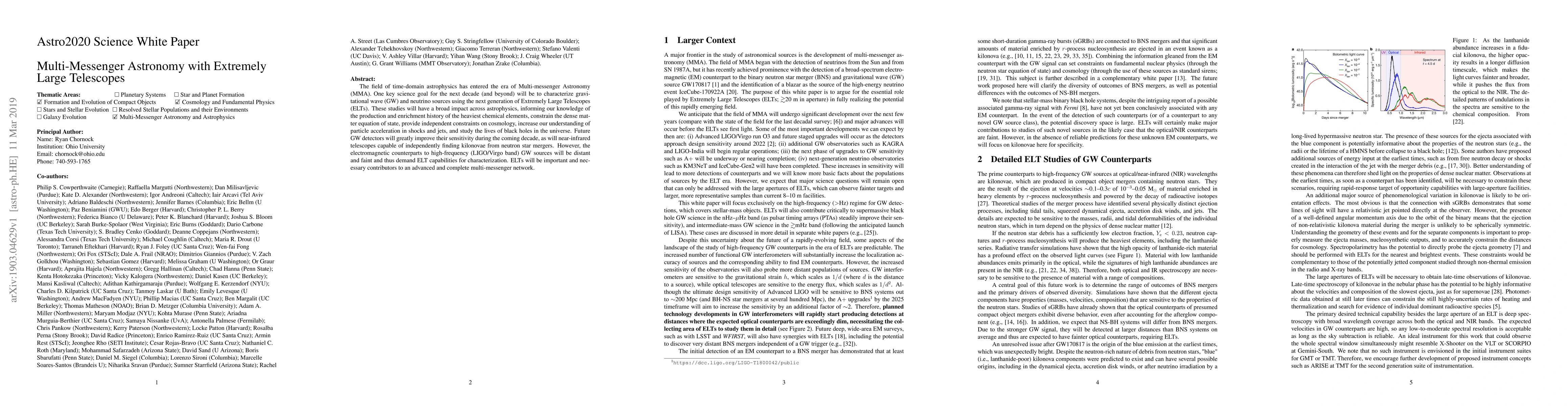 The field of time-domain astrophysics has entered the era of Multi-messenger Astronomy (MMA). One key science goal for the next decade (and beyond) will be to characterize gravitational wave (GW) and neutrino sources using the next generation of Extremely Large Telescopes (ELTs). These studies will have a broad impact across astrophysics, informing our knowledge of the production and enrichment history of the heaviest chemical elements, constrain the dense matter equation of state, provide independent constraints on cosmology, increase our understanding of particle acceleration in shocks and jets, and study the lives of black holes in the universe. Future GW detectors will greatly improve their sensitivity during the coming decade, as will near-infrared telescopes capable of independently finding kilonovae from neutron star mergers. However, the electromagnetic counterparts to high-frequency (LIGO/Virgo band) GW sources will be distant and faint and thus demand ELT capabilities for characterization. ELTs will be important and necessary contributors to an advanced and complete multi-messenger network.