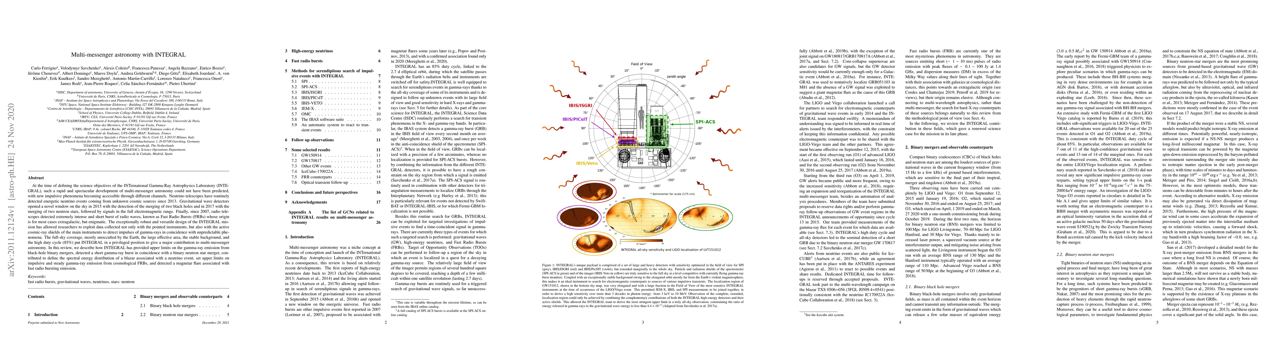 At the time of defining the science objectives of the INTernational Gamma-Ray Astrophysics Laboratory (INTEGRAL), such a rapid and spectacular development of multi-messenger astronomy could not have been predicted, with new impulsive phenomena becoming accessible through different channels. Neutrino telescopes have routinely detected energetic neutrino events coming from unknown cosmic sources since 2013. Gravitational wave detectors opened a novel window on the sky in 2015 with the detection of the merging of two black holes and in 2017 with the merging of two neutron stars, followed by signals in the full electromagnetic range. Finally, since 2007, radio telescopes detected extremely intense and short burst of radio waves, known as Fast Radio Bursts (FRBs) whose origin is for most cases extragalactic, but enigmatic. The exceptionally robust and versatile design of the INTEGRAL mission has allowed researchers to exploit data collected not only with the pointed instruments, but also with the active cosmic-ray shields of the main instruments to detect impulses of gamma-rays in coincidence with unpredictable phenomena. The full-sky coverage, mostly unocculted by the Earth, the large effective area, the stable background, and the high duty cycle (85%) put INTEGRAL in a privileged position to give a major contribution to multi-messenger astronomy. In this review, we describe how INTEGRAL has provided upper limits on the gamma-ray emission from black-hole binary mergers, detected a short gamma-ray burst in coincidence with a binary neutron star merger, contributed to define the spectral energy distribution of a blazar associated with a neutrino event, set upper limits on impulsive and steady gamma-ray emission from cosmological FRBs, and detected a magnetar flare associated with fast radio bursting emission.
