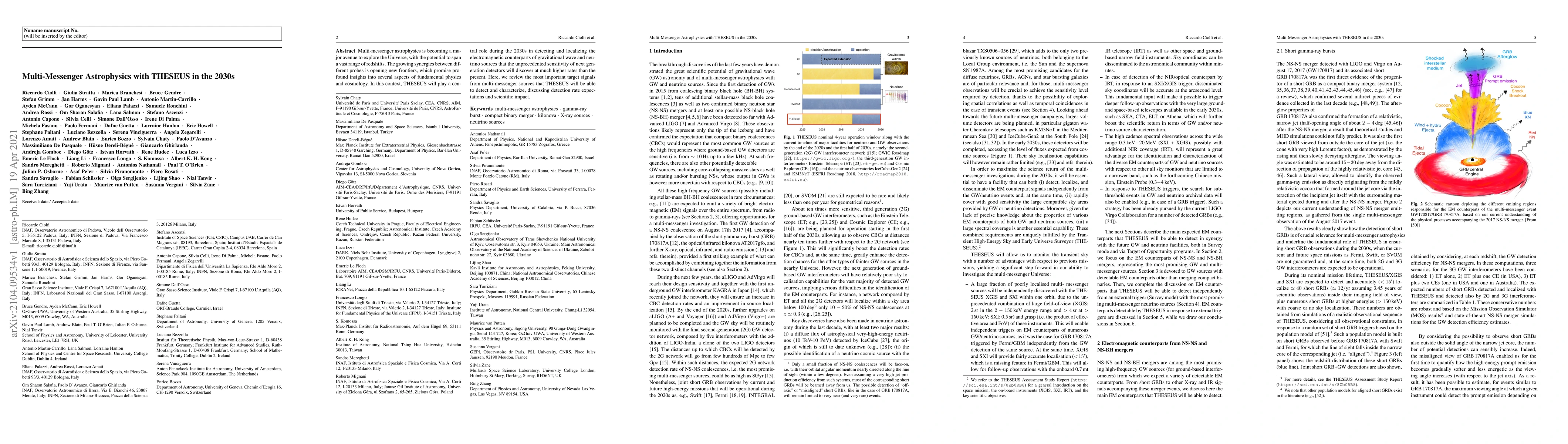 This paper reviews the role of the THESEUS mission in advancing multi-messenger astrophysics in the 2030s, focusing on its ability to detect and localize electromagnetic counterparts of gravitational wave and neutrino sources, and its potential to provide profound insights into fundamental physics and cosmology.