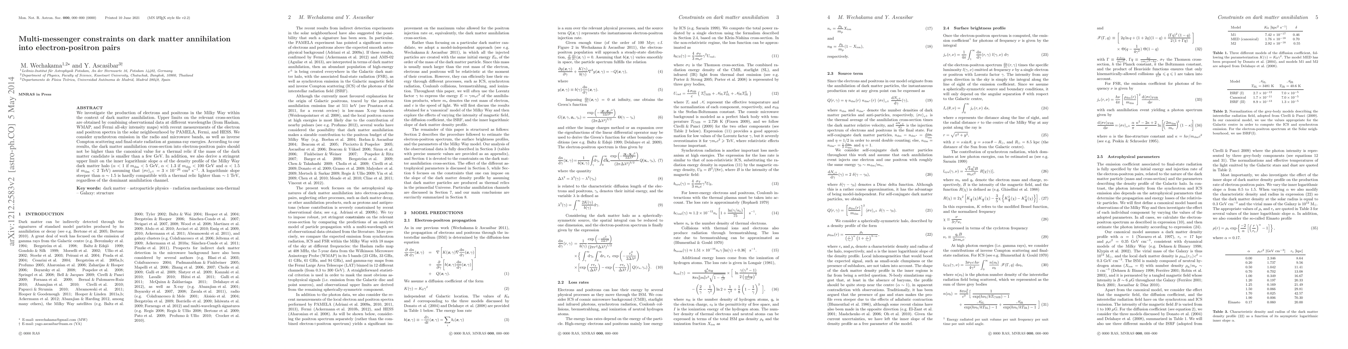 We investigate the production of electrons and positrons in the Milky Way within the context of dark matter annihilation. Upper limits on the relevant cross-section are obtained by combining observational data at different wavelengths (from Haslam, WMAP, and Fermi all-sky intensity maps) with recent measurements of the electron and positron spectra in the solar neighbourhood by PAMELA, Fermi, and HESS. We consider synchrotron emission in the radio and microwave bands, as well as inverse Compton scattering and final-state radiation at gamma-ray energies. According to our results, the dark matter annihilation cross-section into electron-positron pairs should not be higher than the canonical value for a thermal relic if the mass of the dark matter candidate is smaller than a few GeV. In addition, we also derive a stringent upper limit on the inner logarithmic slope, alpha, of the density profile of the Milky Way dark matter halo (alpha < 1 if m_dm < 5 GeV, alpha < 1.3 if m_dm < 100 GeV and alpha < 1.5 if m_dm < 2 TeV) assuming that cross-section = 3 x 10^(-26) cm^3 s(-1). A logarithmic slope steeper than alpha about 1.5 is hardly compatible with a thermal relic lighter than about 1 TeV, regardless of the dominant annihilation channel.