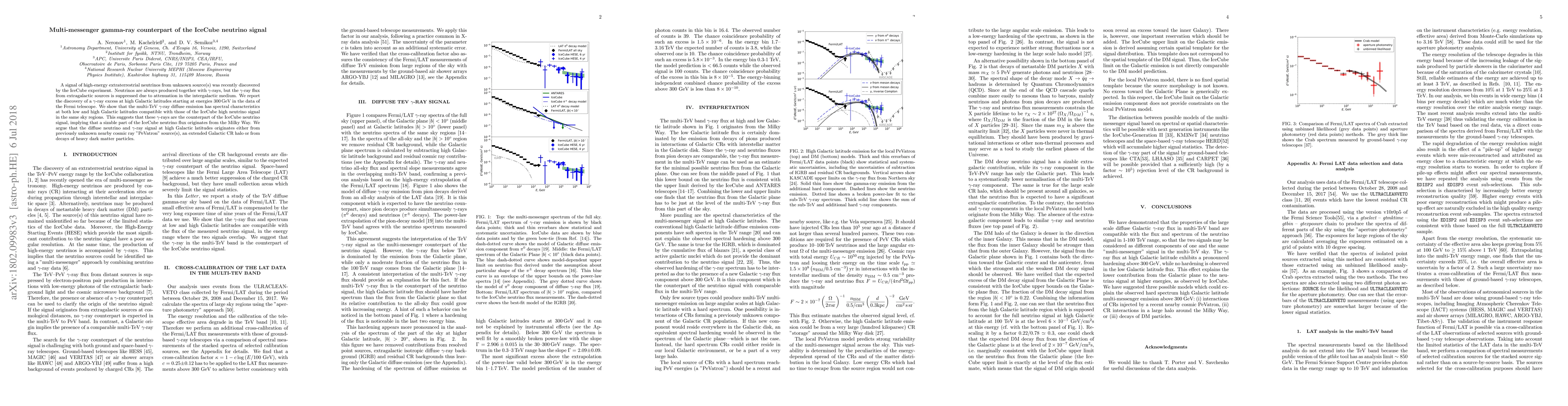 A signal of high-energy extraterrestrial neutrinos from unknown source(s) was recently discovered by the IceCube experiment. Neutrinos are always produced together with gamma-rays, but the gamma-ray flux from extragalactic sources is suppressed due to attenuation in the intergalactic medium. We report the discovery of a gamma-ray excess at high Galactic latitudes starting at energies 300 GeV in the data of the Fermi telescope. We show that the multi-TeV gamma-ray diffuse emission has spectral characteristics at both low and high Galactic latitudes compatible with those of the IceCube high neutrino signal in the same sky regions. This suggests that these gamma-rays are the counterpart of the IceCube neutrino signal, implying that a sizable part of the IceCube neutrino flux originates from the Milky Way. We argue that the diffuse neutrino and gamma-ray signal at high Galactic latitudes originates either from previously unknown nearby cosmic ray "PeVatron" source(s), an extended Galactic CR halo or from decays of heavy dark matter particles.