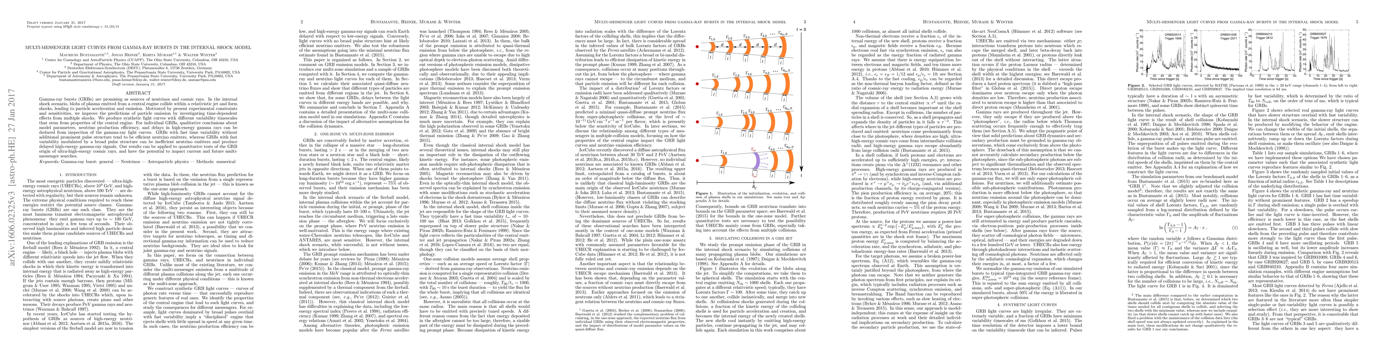 This paper investigates the internal shock model of gamma-ray bursts (GRBs) to predict multi-messenger light curves, focusing on neutrino and cosmic ray production. The study finds that GRBs with fast variability are efficient neutrino emitters, while those with modulated pulses may produce delayed high-energy gamma rays and be less efficient in neutrino emission.