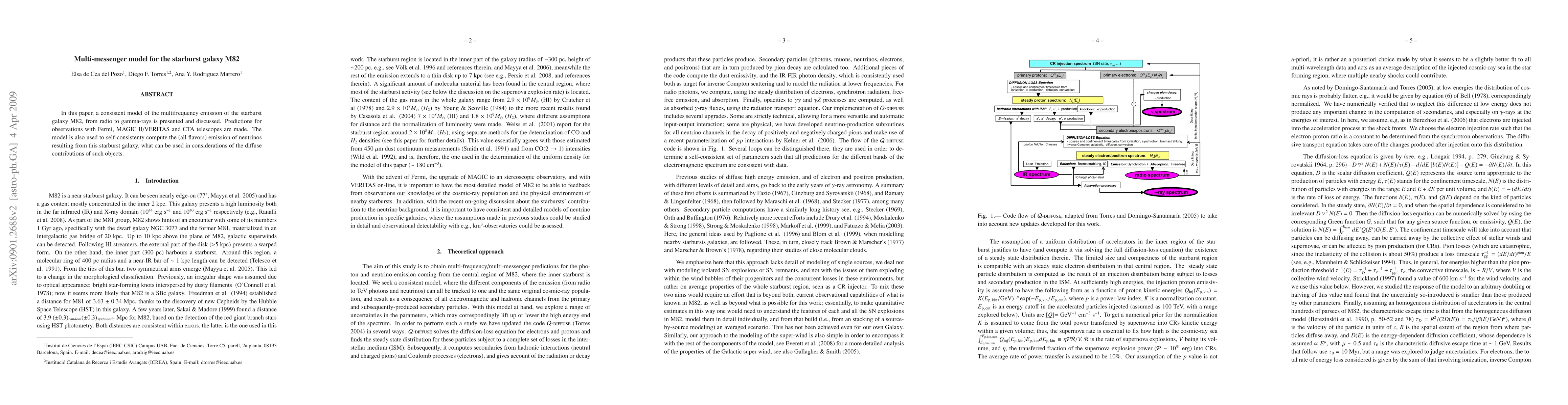 This paper presents a comprehensive model of the multifrequency emission from the starburst galaxy M82, predicting observations across radio to gamma-rays, and computes neutrino emissions that contribute to the diffuse neutrino background. Future observations with Fermi, MAGIC II/VERITAS, and CTA telescopes are anticipated to validate the model.