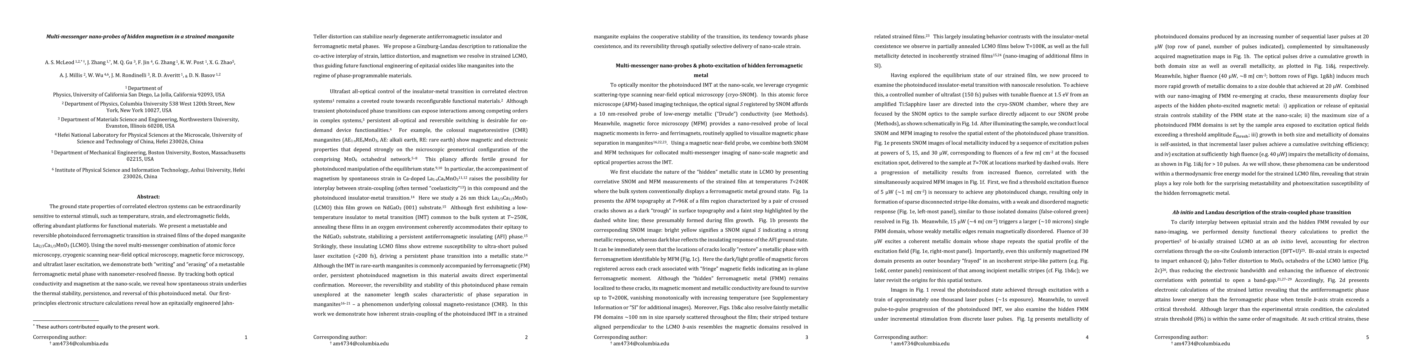 This paper investigates the photoinduced ferromagnetic transition in strained manganite films using a combination of advanced microscopy techniques. It reveals the role of strain in stabilizing a metastable ferromagnetic metal phase and proposes a Ginzburg-Landau framework to explain the interplay between strain, lattice distortion, and magnetism.
