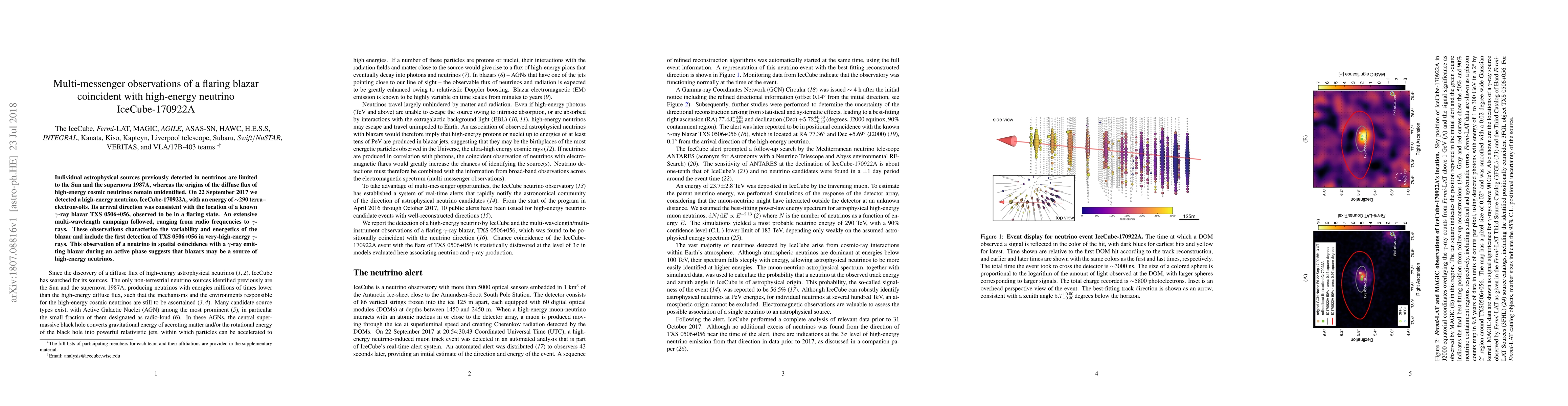 This paper reports the detection of a high-energy neutrino, IceCube-170922A, coincident with a flaring gamma-ray blazar, TXS 0506+056, suggesting blazars may be sources of high-energy cosmic neutrinos. Multi-wavelength observations confirmed the blazar's active state and detected it in very-high-energy gamma-rays for the first time.