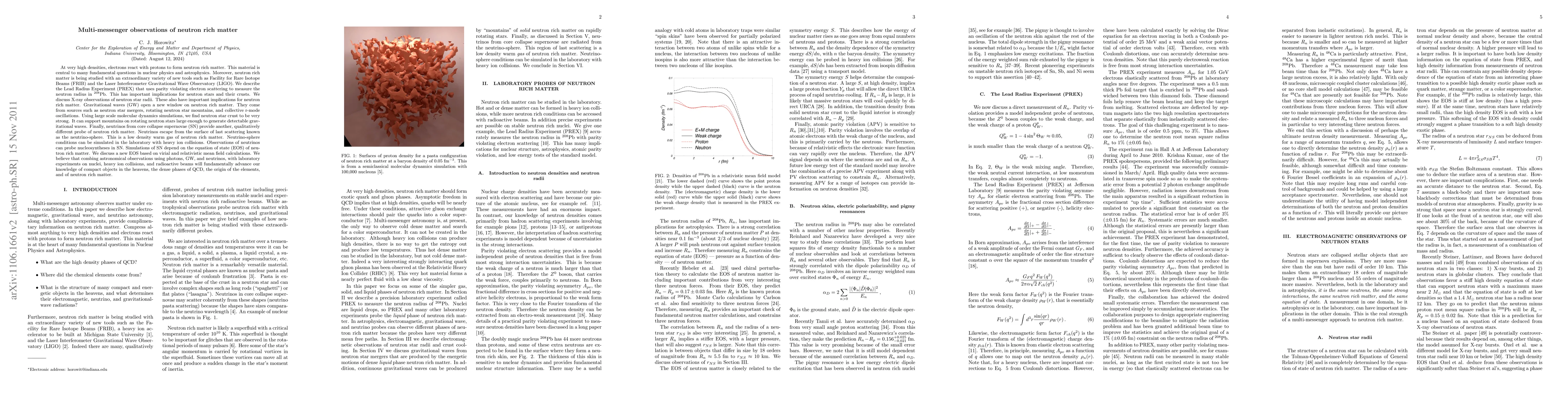 This paper explores the study of neutron-rich matter through multi-messenger observations, including the Lead Radius Experiment, X-ray observations of neutron stars, gravitational waves, and neutrinos from supernovae. It highlights the importance of these observations in understanding neutron star properties and the equation of state for neutron-rich matter.