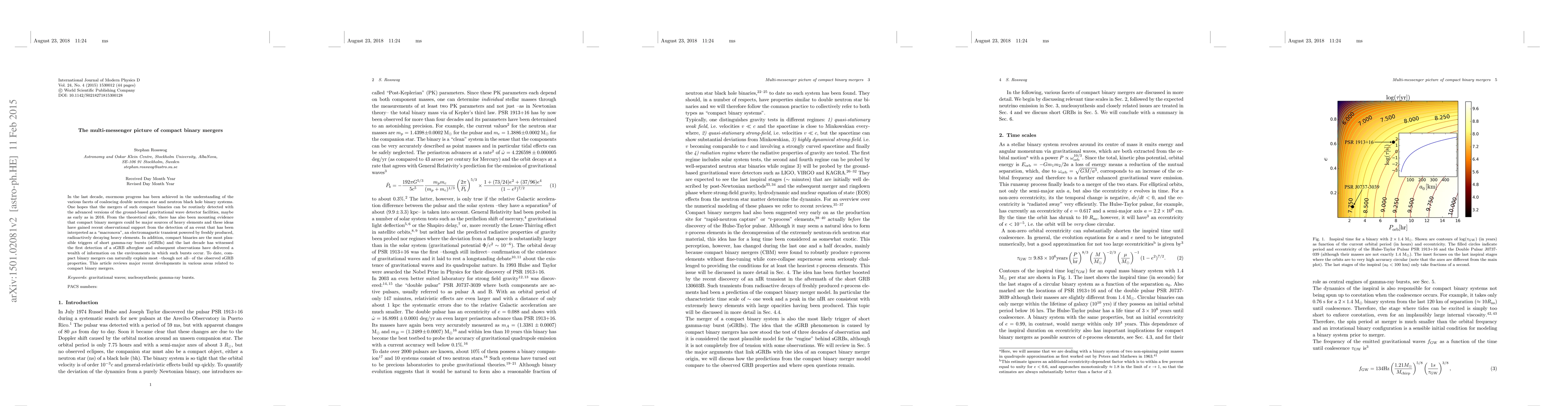 This paper reviews significant advancements in the detection and understanding of compact binary mergers, including neutron star and neutron-black hole systems, through gravitational waves and electromagnetic signals, highlighting their role in producing heavy elements and triggering short gamma-ray bursts.