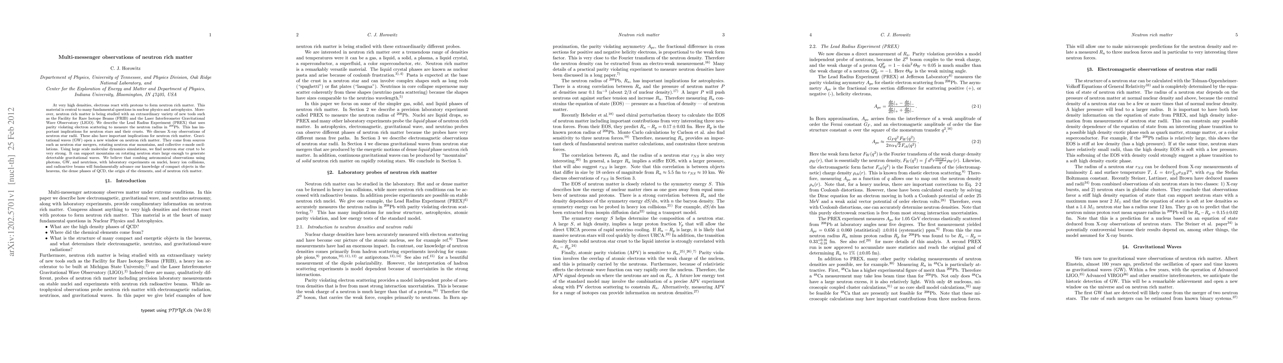 At very high densities, electrons react with protons to form neutron rich matter. This material is central to many fundamental questions in nuclear physics and astrophysics. Moreover, neutron rich matter is being studied with an extraordinary variety of new tools such as the Facility for Rare Isotope Beams (FRIB) and the Laser Interferometer Gravitational Wave Observatory (LIGO). We describe the Lead Radius Experiment (PREX) that uses parity violating electron scattering to measure the neutron radius in $^{208}$Pb. This has important implications for neutron stars and their crusts. We discuss X-ray observations of neutron star radii. These also have important implications for neutron rich matter. Gravitational waves (GW) open a new window on neutron rich matter. They come from sources such as neutron star mergers, rotating neutron star mountains, and collective r-mode oscillations. Using large scale molecular dynamics simulations, we find neutron star crust to be very strong. It can support mountains on rotating neutron stars large enough to generate detectable gravitational waves. We believe that combing astronomical observations using photons, GW, and neutrinos, with laboratory experiments on nuclei, heavy ion collisions, and radioactive beams will fundamentally advance our knowledge of compact objects in the heavens, the dense phases of QCD, the origin of the elements, and of neutron rich matter.