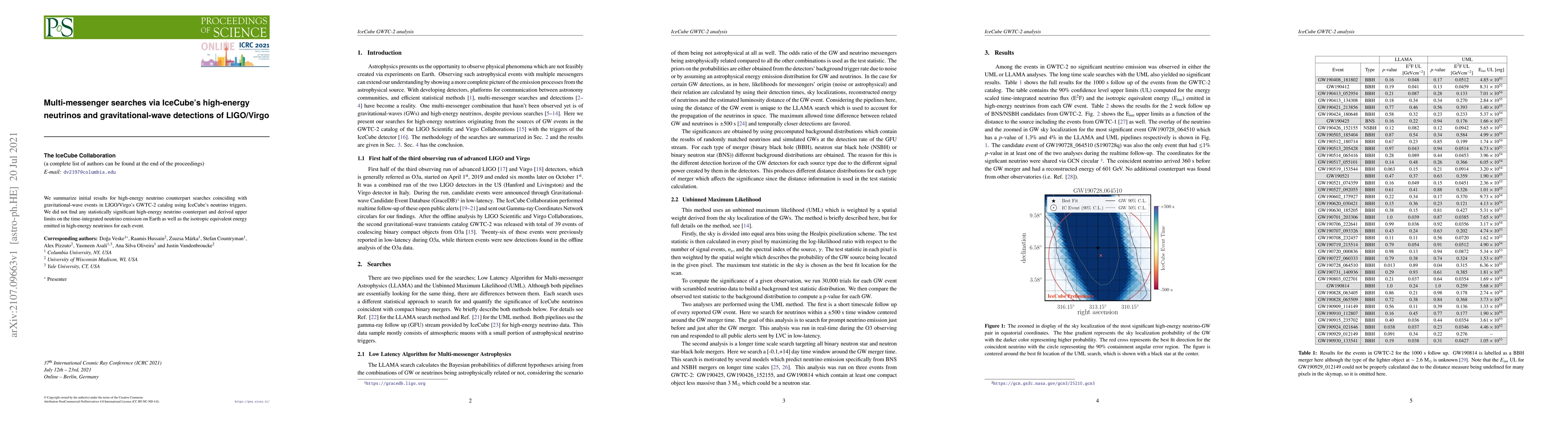 We summarize initial results for high-energy neutrino counterpart searches coinciding with gravitational-wave events in LIGO/Virgo's GWTC-2 catalog using IceCube's neutrino triggers. We did not find any statistically significant high-energy neutrino counterpart and derived upper limits on the time-integrated neutrino emission on Earth as well as the isotropic equivalent energy emitted in high-energy neutrinos for each event.